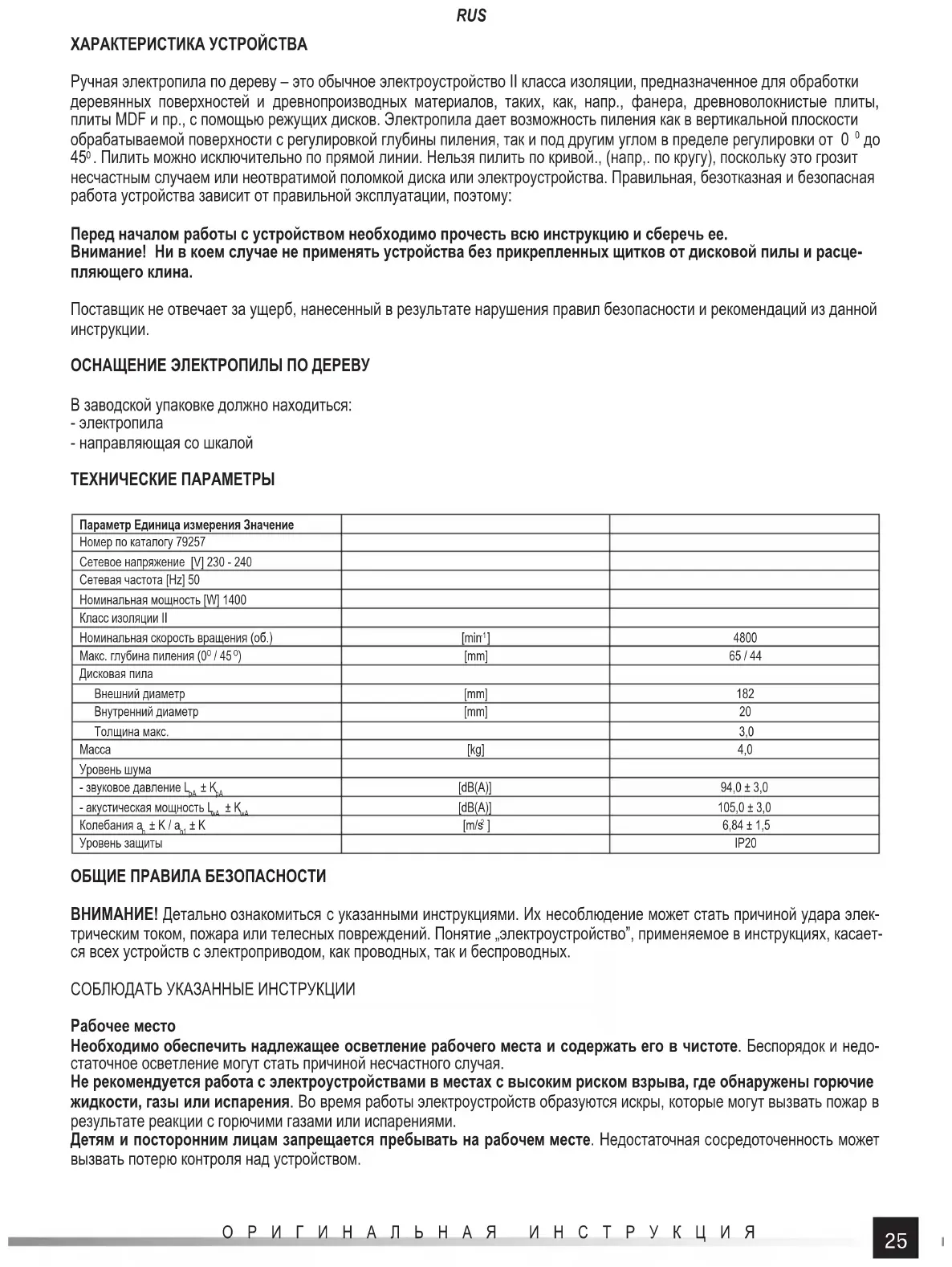 . Пилить можно исключительно по прямой линии. Нельзя пилить по кривой., (напр,. по кругу), поскольку это грозит несчастным случаем или неотвратимой поломкой диска или электроустройства. Правильная, безотказная и безопасная работа устройства зависит от правильной эксплуатации, поэтому: Перед началом работы с устройством необходимо прочесть всю инструкцию и сберечь ее. Внимание! Ни в коем случае не применять устройства без прикрепленных щитков от дисковой пилы и расце- пляющего клина. Поставщик не отвечает за ущерб, нанесенный в результате нарушения правил безопасности и рекомендаций из данной инструкции. ОСНАЩЕНИЕ ЭЛЕКТРОПИЛЫ ПО ДЕРЕВУ В заводской упаковке должно находиться: - электропила - направляющая со шкалой ТЕХНИЧЕСКИЕ ПАРАМЕТРЫ Параметр Единица измерения Значение Номер по каталогу 79257 Сетевое напряжение [V] 230 - 240 Сетевая частота [Hz] 50 Номинальная мощность [W] 1400 Класс изоляции II Номинальная скорость вращения (об.) [min
