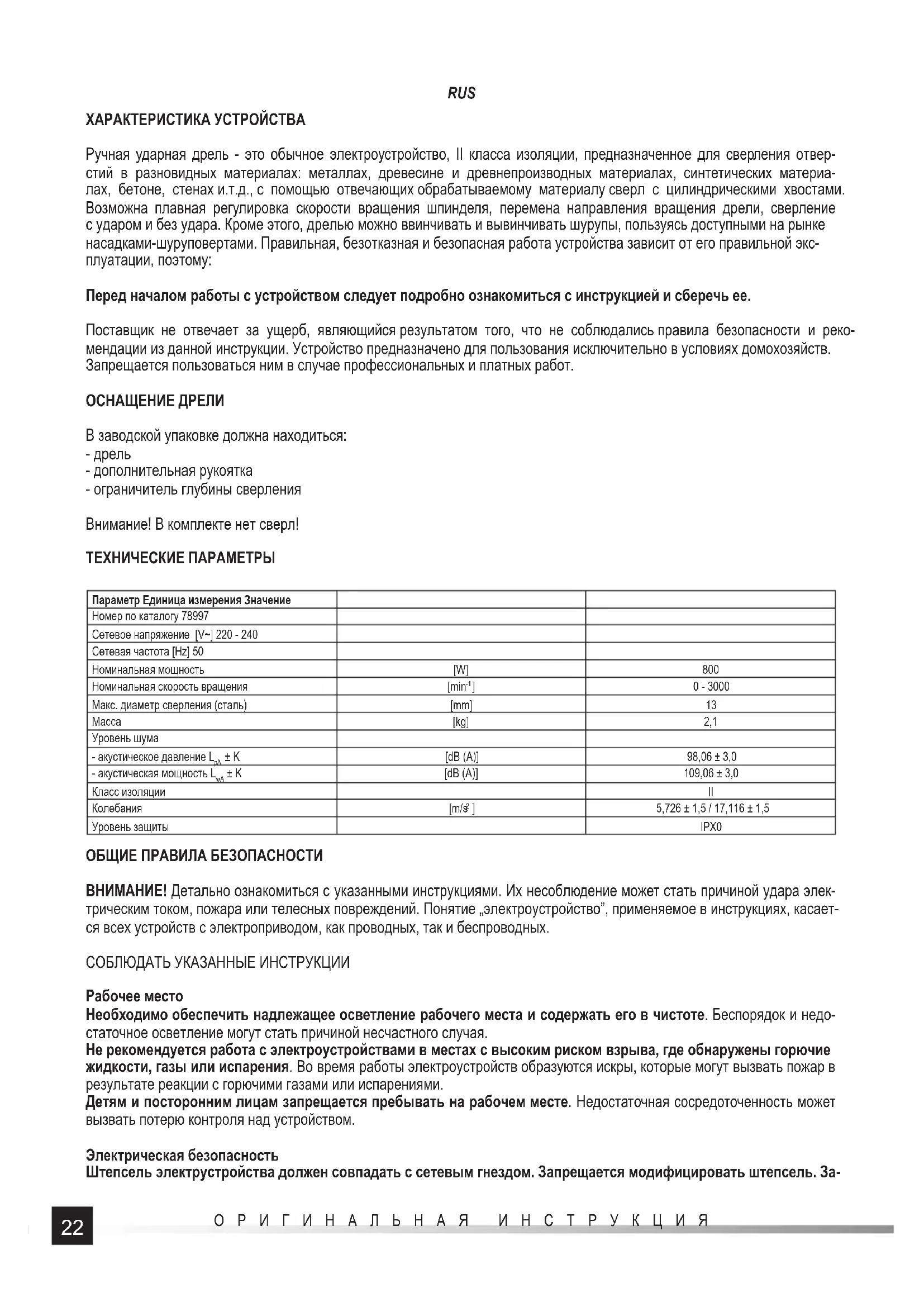 ] 5,726 ± 1,5 / 17,116 ± 1,5 Уровень защиты IPX0 ОБЩИЕ ПРАВИЛА БЕЗОПАСНОСТИ ВНИМАНИЕ! Детально ознакомиться с указанными инструкциями. Их несоблюдение может стать причиной удара элек- трическим током, пожара или телесных повреждений. Понятие „электроустройство”, применяемое в инструкциях, касает- ся всех устройств с электроприводом, как проводных, так и беспроводных. СОБЛЮДАТЬ УКАЗАННЫЕ ИНСТРУКЦИИ Рабочее место Необходимо обеспечить надлежащее осветление рабочего места и содержать его в чистоте. Беспорядок и недо- статочное осветление могут стать причиной несчастного случая. Не рекомендуется работа с электроустройствами в местах с высоким риском взрыва, где обнаружены горючие жидкости, газы или испарения. Во время работы электроустройств образуются искры, которые могут вызвать пожар в результате реакции с горючими газами или испарениями. Детям и посторонним лицам запрещается пребывать на рабочем месте. Недостаточная сосредоточенность может вызвать потерю контроля над устройством. Электрическая безопасность Штепсель электрустройства должен совпадать с сетевым гнездом. Запрещается модифицировать штепсель. За-23 ОРИГИНАЛЬНАЯ ИНСТРУКЦИЯ RUS прещается пользоваться адаптерами с целью соединения штепселя с гнездом. Не модифицированный штепсель, совпадающий с гнездом, уменьшает риск поражения электричсеким током. Необходимо избегать контакта с заземленными поверхностями, такими, как трубы, батареи и холодильники. За- земление тела повышает риск удара электрическим током. Не подвергать электроустройства влиянию атмосферных осадков или влаги. Вода и влага, проникая внутрь элек- троустройства, повышают риск поломки устройства и телесных повреждений. Не перегружать провода питания. Не пользоваться проводом питания с целью передвижения, подключения и от- ключения штепселя от гнезда сети питания. Избегать контакта провода питания с теплыми предметами, маслом, острыми краями и подвижными элементами. Повреждение провода питания повышает риск поражения электриче-