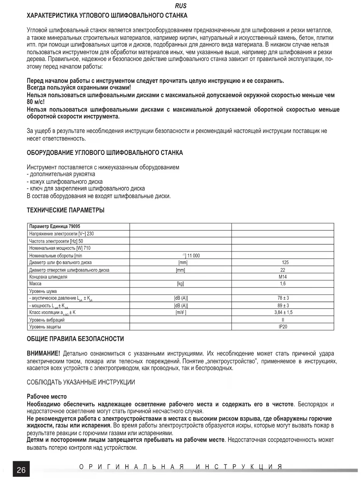 ACHTUNG! Vor dem Beitritt zur Regulierung, technischen Bedienung und Konservierung soll man die Einrichtung von der Elektro- netz durch die Herausziehung des Steckers aus der Netzdose abschalten. Nach der Beendung der Arbeit soll man technischen Stand durch äußere Besichtigungen und die Beurteilung von: Gestell und Handgriff , Elektroleitung mit Stecker und Abbiegungs- stück, Tätigkeit des Elektroschalters, Durchgängigkeit von Lüftungsschlitzen, Funken von Bürsten, Arbeitslautstärke von Lager und Getriebe, Anfahren und Arbeitsgleichmäßigkeit überprüfen. In der Garantiezeit kann der Benutzer keine Elektrowerkzeuge demontieren oder keine Bauteile sowie Bestandteile austauschen, weil dies eine Verlierung der Garantierechte verursacht. Alle beobachtete bei der Übersicht oder in der Arbeitszeit Unrichtigkeiten bestimmen das Signal zur Durchführung der Reparatur im Service. Nach der Beendung der Arbeit soll man Gehäuse, Lüftungsschlitze, Schalter, Zusatzhandgriff und Bedeckungen z.B. mit dem Druckluftstrahl (vom Druck nicht größer als von 0,3 MPa), Pinsel oder trockenen Lappen ohne Benutzung von Chemiemittel und Reinigungsfl üssigkeiten reinigen. Die Werkzeuge und Handgriff e soll man mit dem sauberen, trockenen Lappen reinigen.26 ОРИГИНАЛЬНАЯ ИНСТРУКЦИЯ RUS ХАРАКТЕРИСТИКА УГЛОВОГО ШЛИФОВАЛЬНОГО СТАНКА Угловой шлифовальный станок является электрооборудованием предназначенным для шлифования и резки металлов, а также минеральных строительных материалов, например кирпич, натуральный и искусственный камень, бетон, плитки итп. при помощи шлифовальных щитов и дисков, подобранных для данного вида материала. В никаком случае нельзя пользоваться инструментом для обработки материалов иных, чем указанные выше, например для шлифования и резки дерева. Правильное, надежное и безопасное действие шлифовального станка зависит от правильной эксплуатации, по- этому перед началом работы: Перед началом работы с инструментом следует прочитать целую инструкцию и ее сохранить. Всегда пользуйся охранными очками! Нельзя пользоваться шлифовальными дисками с максимальной допускаемой окружной скоростью меньше чем 80 м/с! Нельзя пользоваться шлифовальными дисками с максимальной допускаемой оборотной скоростью меньше оборотной скорости инструмента. За ущерб в результате несоблюдения инструкции безопасности и рекомендаций настоящей инструкции поставщик не несет ответственность. ОБОРУДОВАНИЕ УГЛОВОГО ШЛИФОВАЛЬНОГО СТАНКА Инструмент поставляется с нижеуказанным оборудованием - дополнительная рукоятка - кожух шлифовального диска - ключ для закрепления шлифовального диска В состав оборудования не входят шлифовальные диски. ТЕХНИЧЕСКИЕ ПАРАМЕТРЫ Параметр Единица 79095 Напряжение электросети [V~] 230 Частота электросети [Hz] 50 Номинальная мощность [W] 710 Номинальные обороты [min