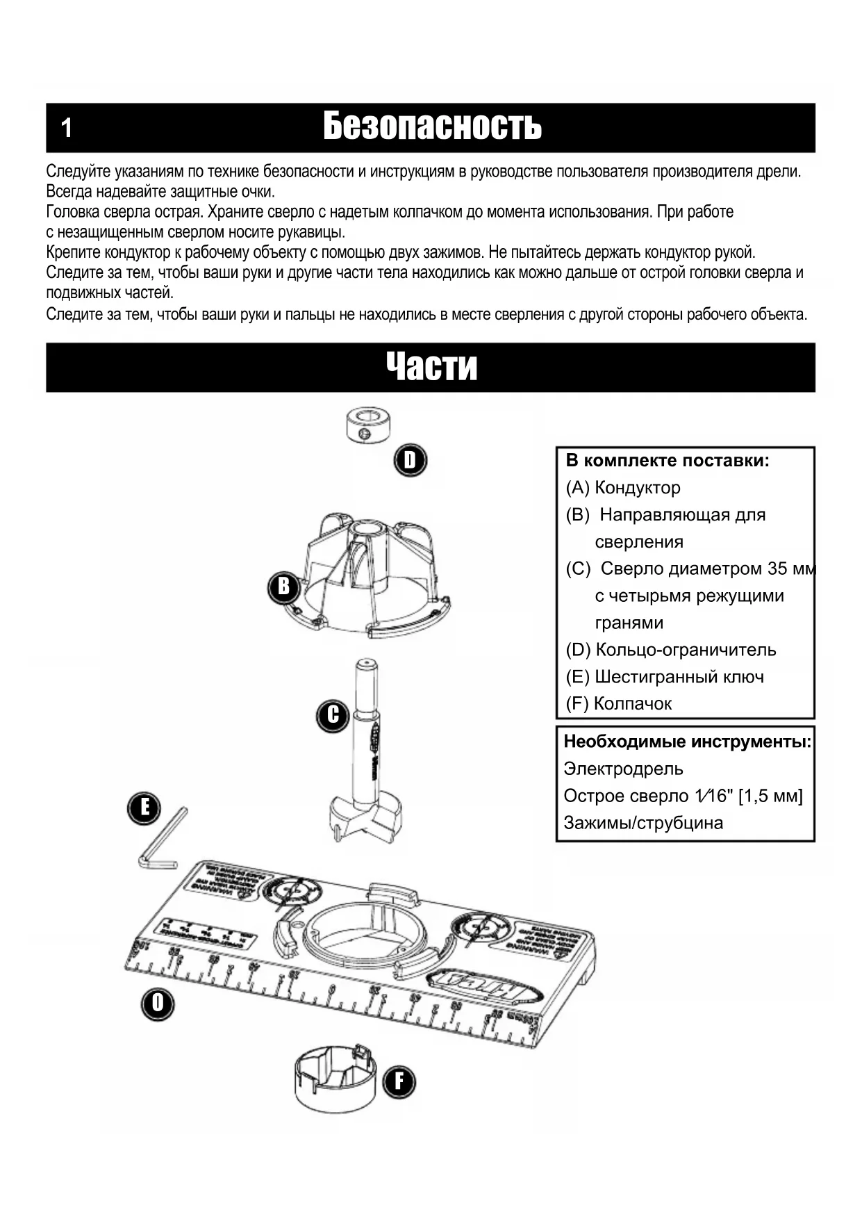 Следуйте указаниям по технике безопасности и инструкциям в руководстве пользователя производителя дрели. Всегда надевайте защитные очки. Головка сверла острая. Храните сверло с надетым колпачком до момента использования. При работе с незащищенным сверлом носите рукавицы. Крепите кондуктор к рабочему объекту с помощью двух зажимов. Не пытайтесь держать кондуктор рукой. Следите за тем, чтобы ваши руки и другие части тела находились как можно дальше от острой головки сверла и подвижных частей. Следите за тем, чтобы ваши руки и пальцы не находились в месте сверления с другой стороны рабочего объекта.