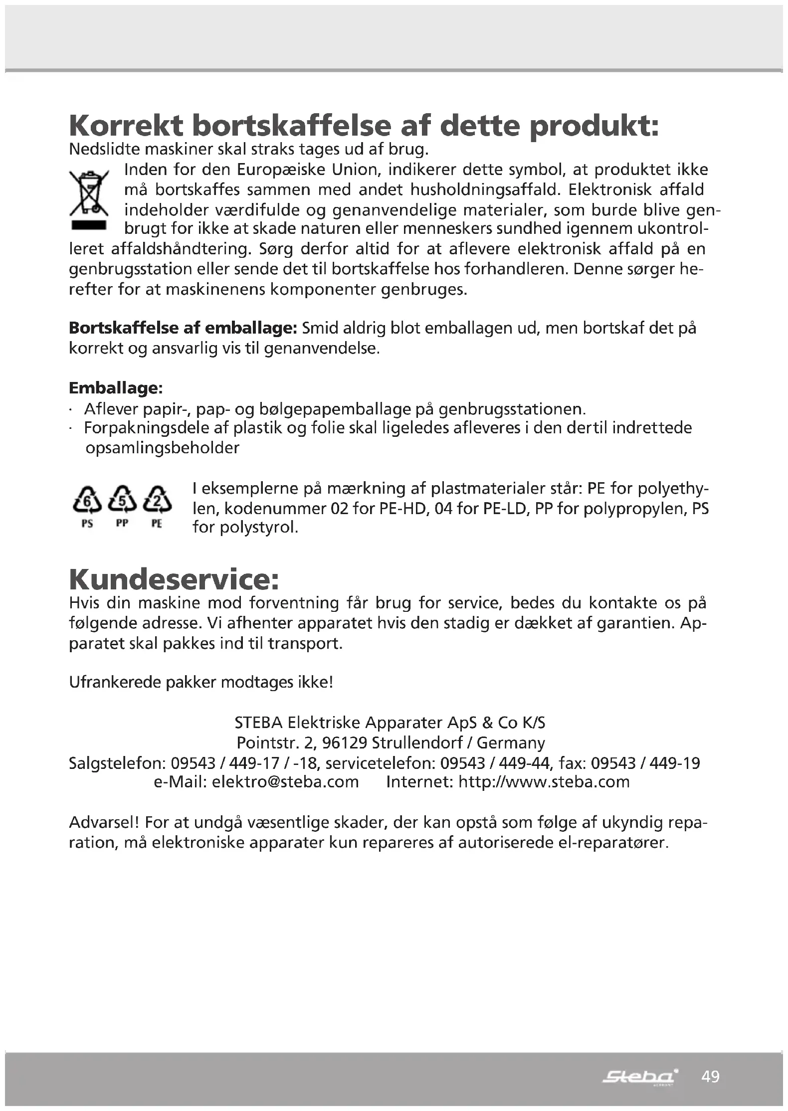 Прибор будет занимать меньше места, если хранить его вертикально, поставивназаднееребро.Дляэтогозакройтеприбор,вставьтезадвижкув подставкуисвернитепровод(рис.10).56 Правильная утилизация изделия: Отслужившийприборнемедленноприведитевнегодность. Натерритор ииЕСд ан н ыйсим в олук азыв аетнато,ч тод анн оеиз дел ие не подлежит утилизации вместе с бытовыми отходами. Старые приборы содержат ценныеперерабатываемыематериалы,которые следует сдать на переработку, чтобы предотвратить нанесение ущербаокружающейсредеичеловеческомуздоровьюиз-забесконтрольного выбросамусора.Поэтому,пожалуйста,утилизируйтеотслужившиеприборы через специальные системы сбора мусора или отвезите прибор для утилизации в место, где он был приобретен. Ответственная организация отправитприборнапереработку. Утилизация упаковочных материалов Невыбрасывайтеупаковочныйматериал,отправьтеегонапереработку. Упаковка прибора: ∙ Бумагу,картонигофрированныйкартонсдатьвпунктсборамакулатуры ∙ Полимерные упаковочные материалы и пленку также следует утилизироватьчерезсоответствующиепунктысбора Примеры обозначения полимерных материалов: РЕ – полиэтилен,код02дляполиэтиленавысокойплотности,04 дляполиэтиленанизкойплотности,РР–полипропилен,PS –полистирол.5758
