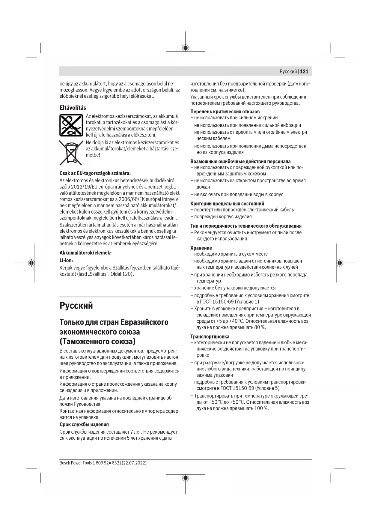 Уполномоченная изготовителем организация: ООО «Роберт Бош» Вашутинское шоссе, вл. 24 141400, г. Химки, Московская обл. Тел.: +7 800 100 8007 E-Mail: info.powertools@ru.bosch.com www.bosch-pt.ru Дополнительные адреса сервисных центров вы найдете по ссылке: www.bosch-pt.com/serviceaddresses В случае выхода электроинструмента из строя в течение гарантийного срока эксплуатации по вине изготовителя, владелец имеет право на бесплатный гарантийный ре- монт, при соблюдении следующих условий: – отсутствие механических повреждений; – отсутствие признаков нарушения требований руко- водства по эксплуатации – наличие в руководстве по эксплуатации отметки про- давца о продаже и подписи покупателя; – соответствие серийного номера электроинструмента и серийному номеру в гарантийном талоне; – отсутствие следов неквалифицированного ремонта. Гарантия не распространяется на: – любые поломки, связанные с форс-мажорными обсто- ятельствами; – нормальный износ: электроинструмента, так же, как и все электрические. Гарантией не покрывается ремонт, потребность в кото- ром возникает вследствие нормального износа, сокра- щающего срок службы таких частей инструмента, как присоединительные контакты, провода, щётки и т.п.: – естественный износ (полная выработка ресурса); – оборудование и его части, выход из строя которых стал следствием неправильной установки, несанкцио- нированной модификации, неправильного примене- ния, нарушение правил обслуживания или хранения; – неисправности, возникшие в результате перегрузки электроинструмента. (К безусловным признакам пере- грузки инструмента относятся: появление цвета побе- жалости, деформация или оплавление деталей и узлов электроинструмента, потемнение или обугливание изоляции проводов электродвигателя под действием высокой температуры.) Bosch Power Tools 1 609 92A 852 | (22.07.2022)130 | Українська Транспортировка На рекомендуемые литий-ионные аккумуляторные бата- реи распространяются требования в отношении транс- портировки опасных грузов. Аккумуляторные батареи могут перевозиться самим пользователем автомобиль- ным транспортом без необходимости соблюдения допол- нительных норм. При перевозке с привлечением третьих лиц (напр.: само- летом или транспортным экспедитором) необходимо соблюдать особые требования к упаковке и маркировке. В этом случае при подготовке груза к отправке необходи- мо участие эксперта по опасным грузам. Отправляйте аккумуляторную батарею только с неповре- жденным корпусом. Заклейте открытые контакты и упа- куйте аккумуляторную батарею так, чтобы она не переме- щалась внутри упаковки. Пожалуйста, соблюдайте также возможные дополнительные национальные предписа-