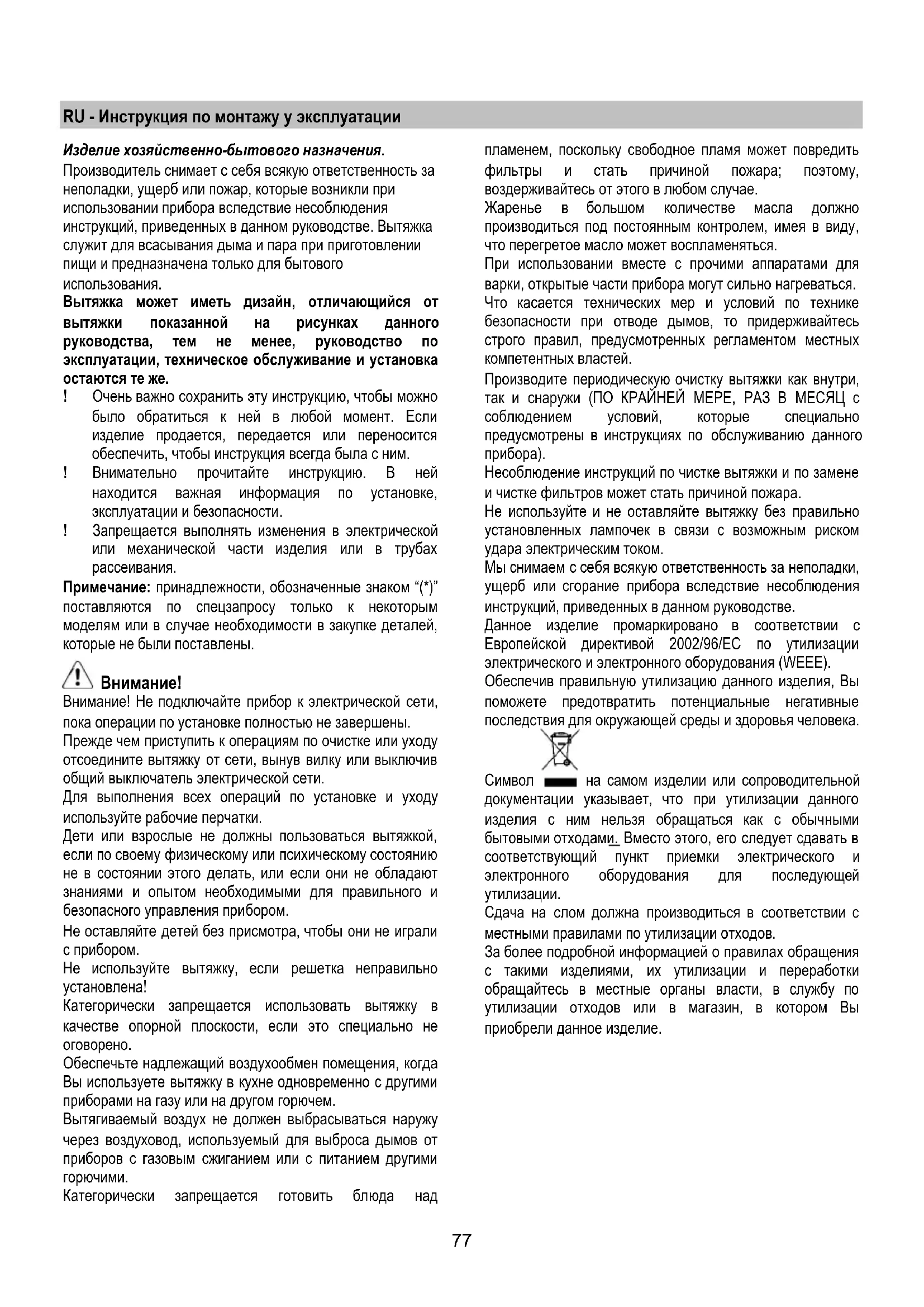Несоблюдение инструкций по чистке вытяжки и по замене и чистке фильтров может стать причиной пожара. Не используйте и не оставляйте вытяжку без правильно установленных лампочек в связи с возможным риском удара электрическим током. Мы снимаем с себя всякую ответственность за неполадки, ущерб или сгорание прибора вследствие несоблюдения инструкций, приведенных в данном руководстве. Данное изделие промаркировано в соответствии с Европейской директивой 2002/96/EC по утилизации электрического и электронного оборудования (WEEE). Обеспечив правильную утилизацию данного изделия, Вы поможете предотвратить потенциальные негативные последствия для окружающей среды и здоровья человека.