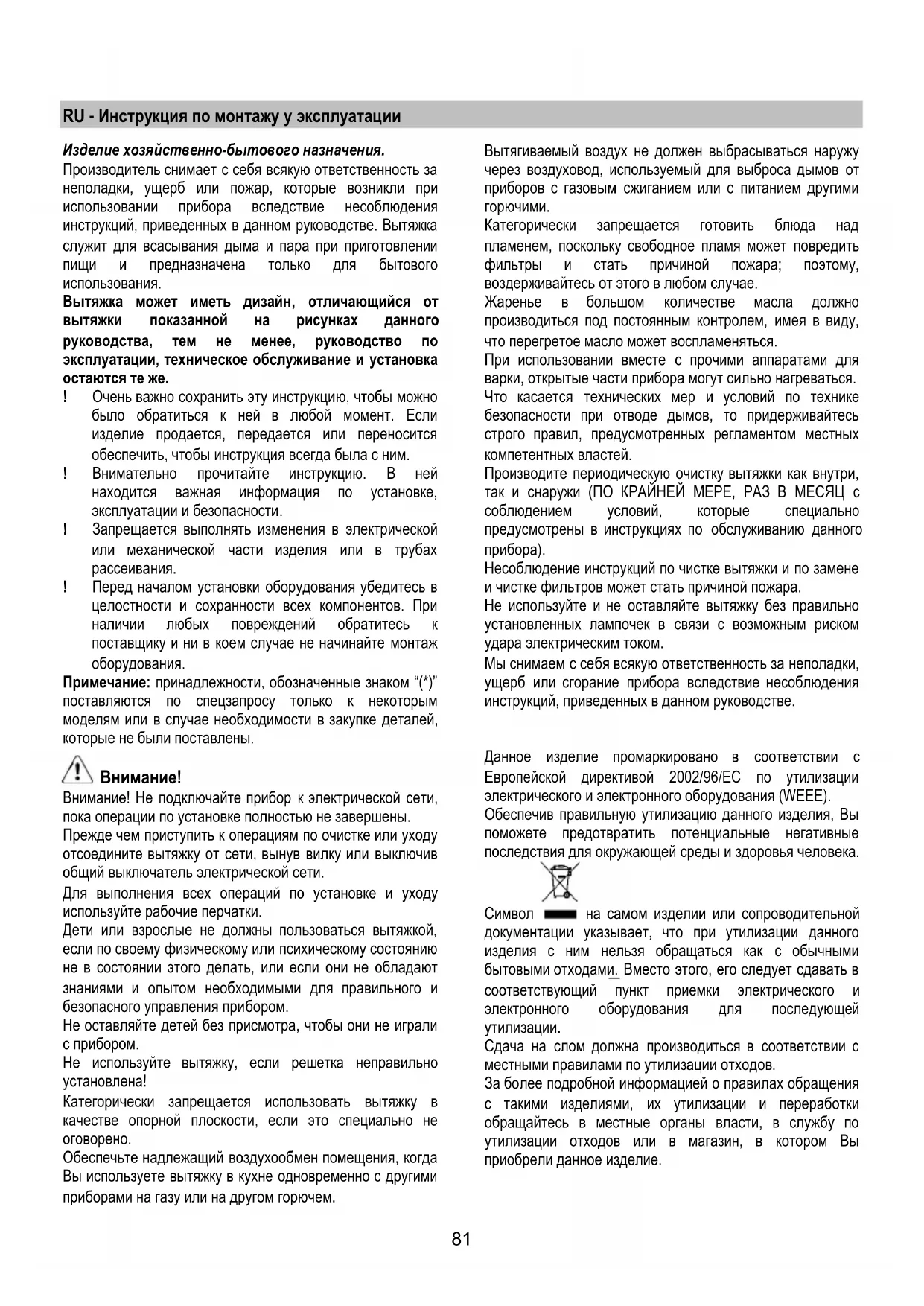 Внимание! Не подключайте прибор к электрической сети, пока операции по установке полностью не завершены. Прежде чем приступить к операциям по очистке или уходу отсоедините вытяжку от сети, вынув вилку или выключив общий выключатель электрической сети. Для выполнения всех операций по установке и уходу используйте рабочие перчатки. Дети или взрослые не должны пользоваться вытяжкой, если по своему физическому или психическому состоянию не в состоянии этого делать, или если они не обладают знаниями и опытом необходимыми для правильного и безопасного управления прибором. Не оставляйте детей без присмотра, чтобы они не играли с прибором. Не используйте вытяжку, если решетка неправильно установлена! Категорически запрещается использовать