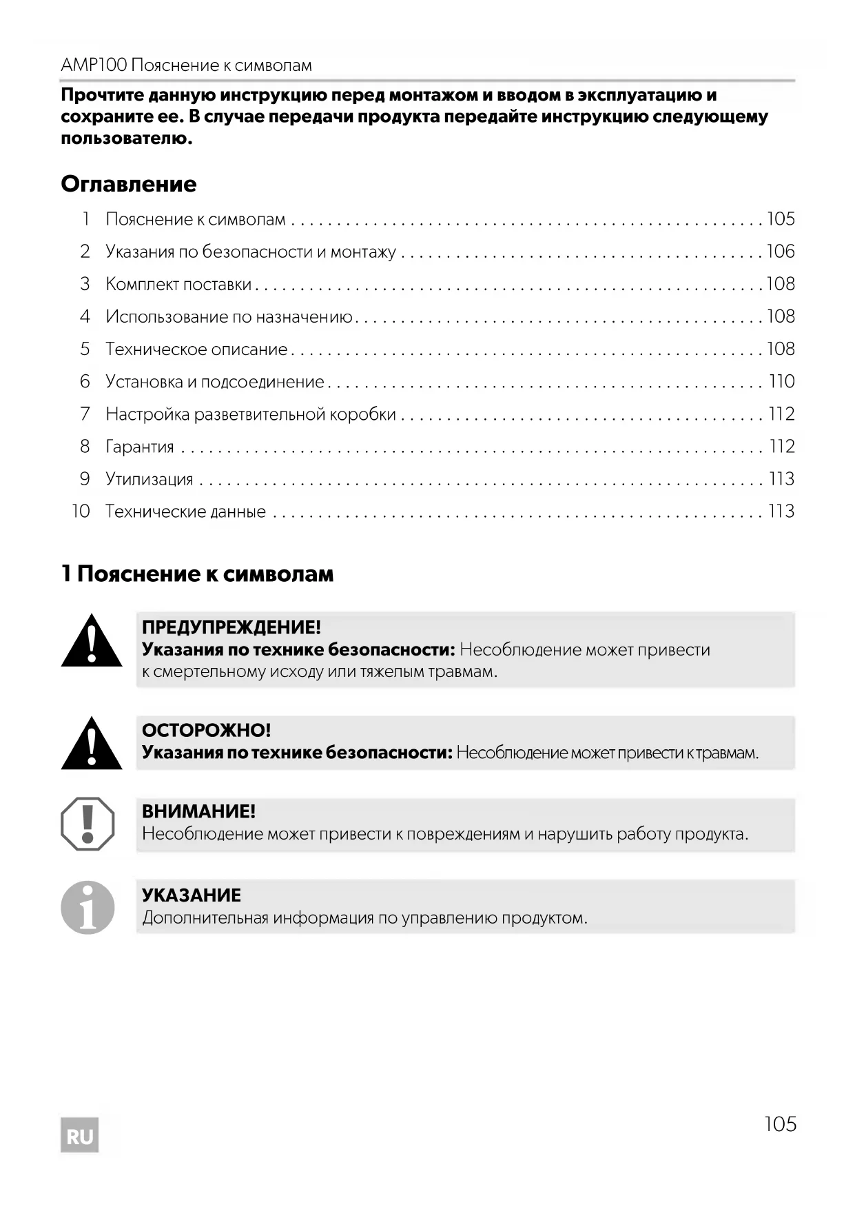 Прочтите данную инструкцию перед монтажом и вводом в эксплуатацию и сохраните ее. В случае передачи продукта передайте инструкцию следующему пользователю.