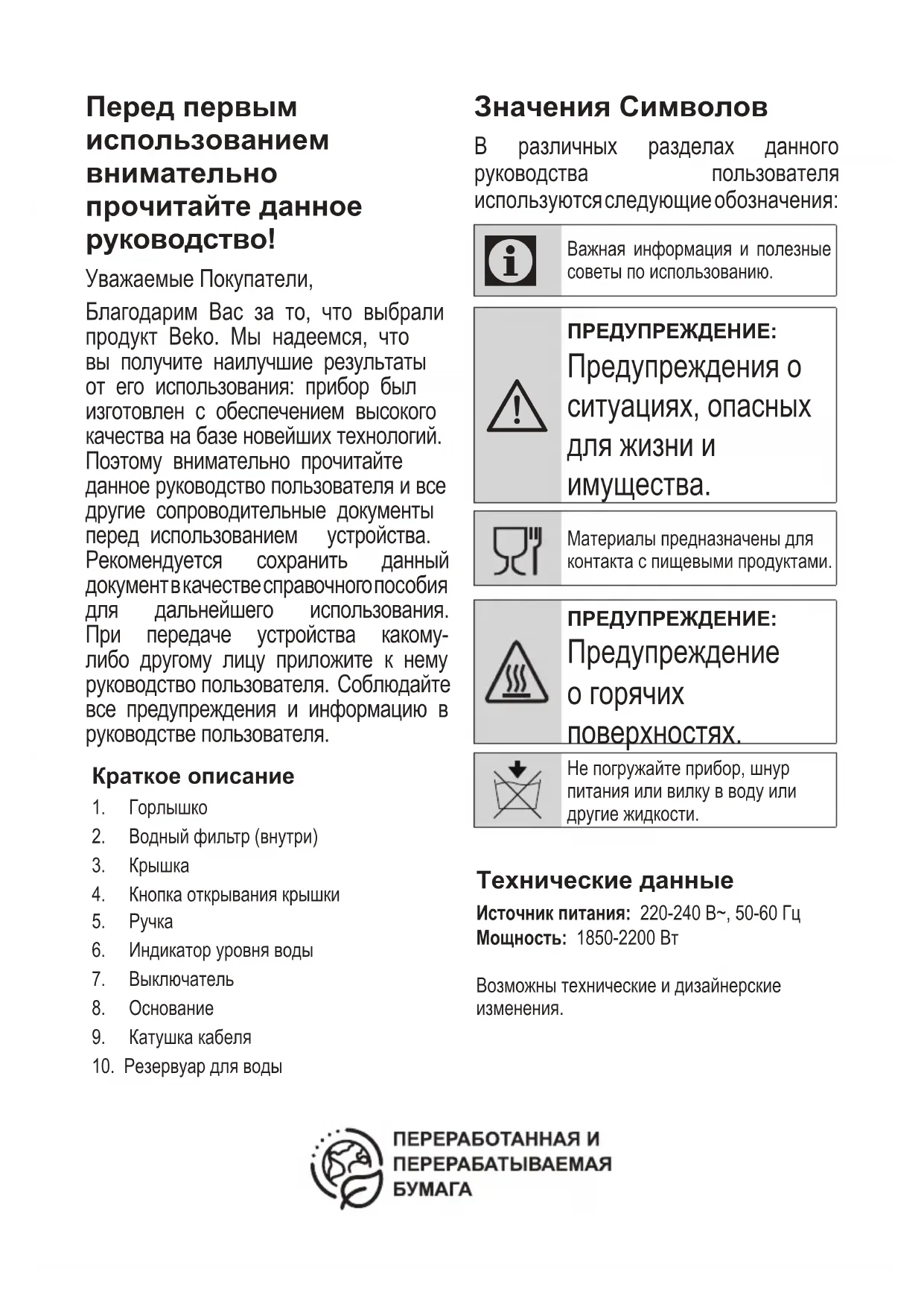 1 2 3Перед первым использованием внимательно прочитайте данное руководство! Уважаемые Покупатели, Благодарим Вас за то, что выбрали продукт Beko. Мы надеемся, что вы получите наилучшие результаты от его использования: прибор был изготовлен с обеспечением высокого качества на базе новейших технологий. Поэтому внимательно прочитайте данное руководство пользователя и все другие сопроводительные документы перед использованием устройства. Рекомендуется сохранить данный документ в качестве справочного пособия для дальнейшего использования. При передаче устройства какому- либо другому лицу приложите к нему руководство пользователя. Соблюдайте все предупреждения и информацию в руководстве пользователя. Краткое описание1. Горлышко2. Водный фильтр (внутри)3. Крышка4. Кнопка открывания крышки5. Ручка6. Индикатор уровня воды7. Выключатель8. Основание 9. Катушка кабеля10. Резервуар для воды Технические данные Источник питания: 220-240 В~, 50-60 ГцМощность: 1850-2200 ВтВозможны технические и дизайнерские изменения. Значения Символов В различных разделах данного руководства пользователя используются следующие обозначения: