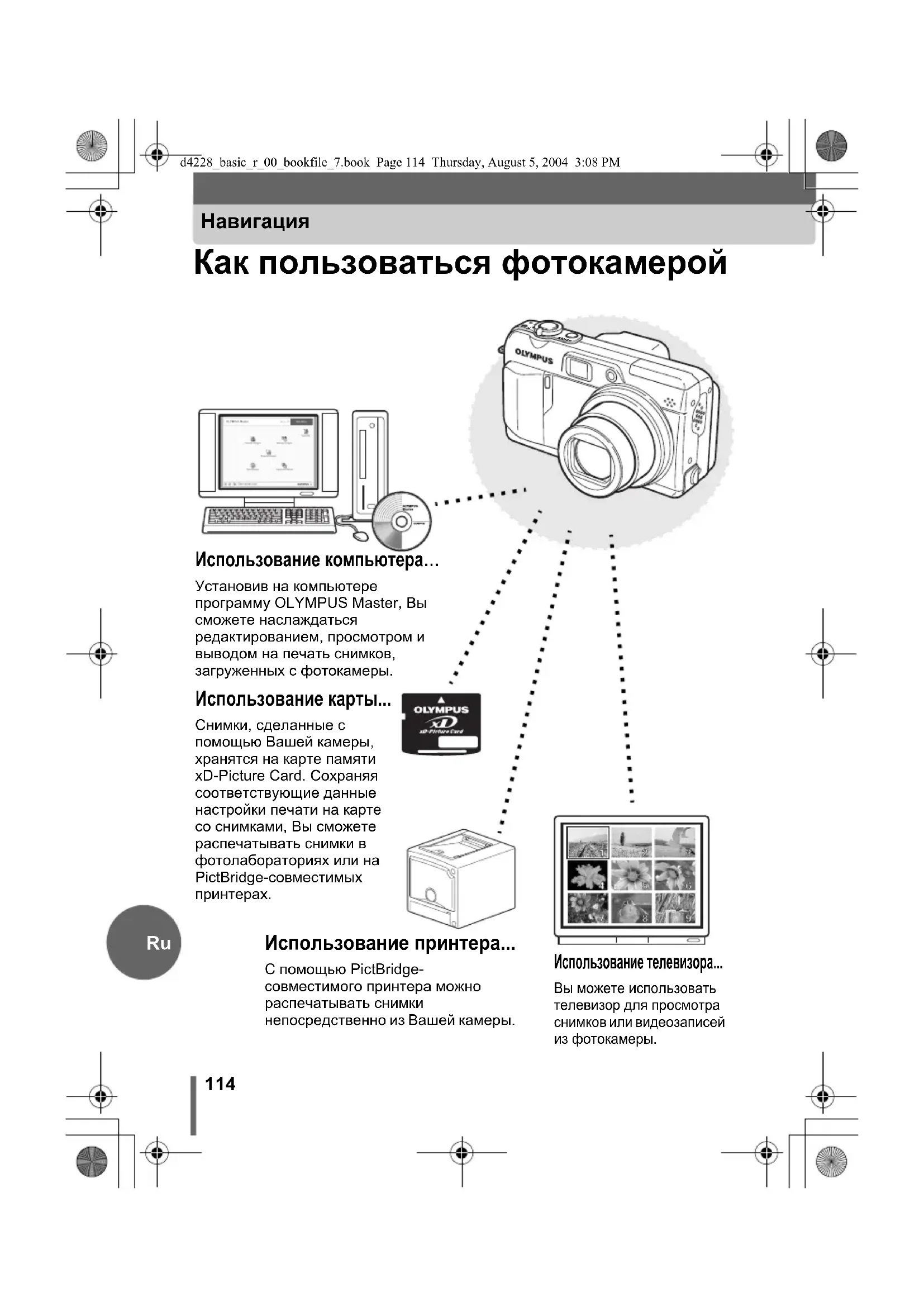 Использование компьютера… Установив на компьютере программу OLYMPUS Master, Вы сможете наслаждаться редактированием, просмотром и выводом на печать снимков, загруженных с фотокамеры. Использование принтера... С помощью PictBridge- совместимого принтера можно распечатывать снимки непосредственно из Вашей камеры. Использование телевизора... Вы можете использовать телевизор для просмотра снимков или видеозаписей из фотокамеры. d4228_basic_r_00_bookfile_7.book Page 114 Thursday, August 5, 2004 3:08 PM115