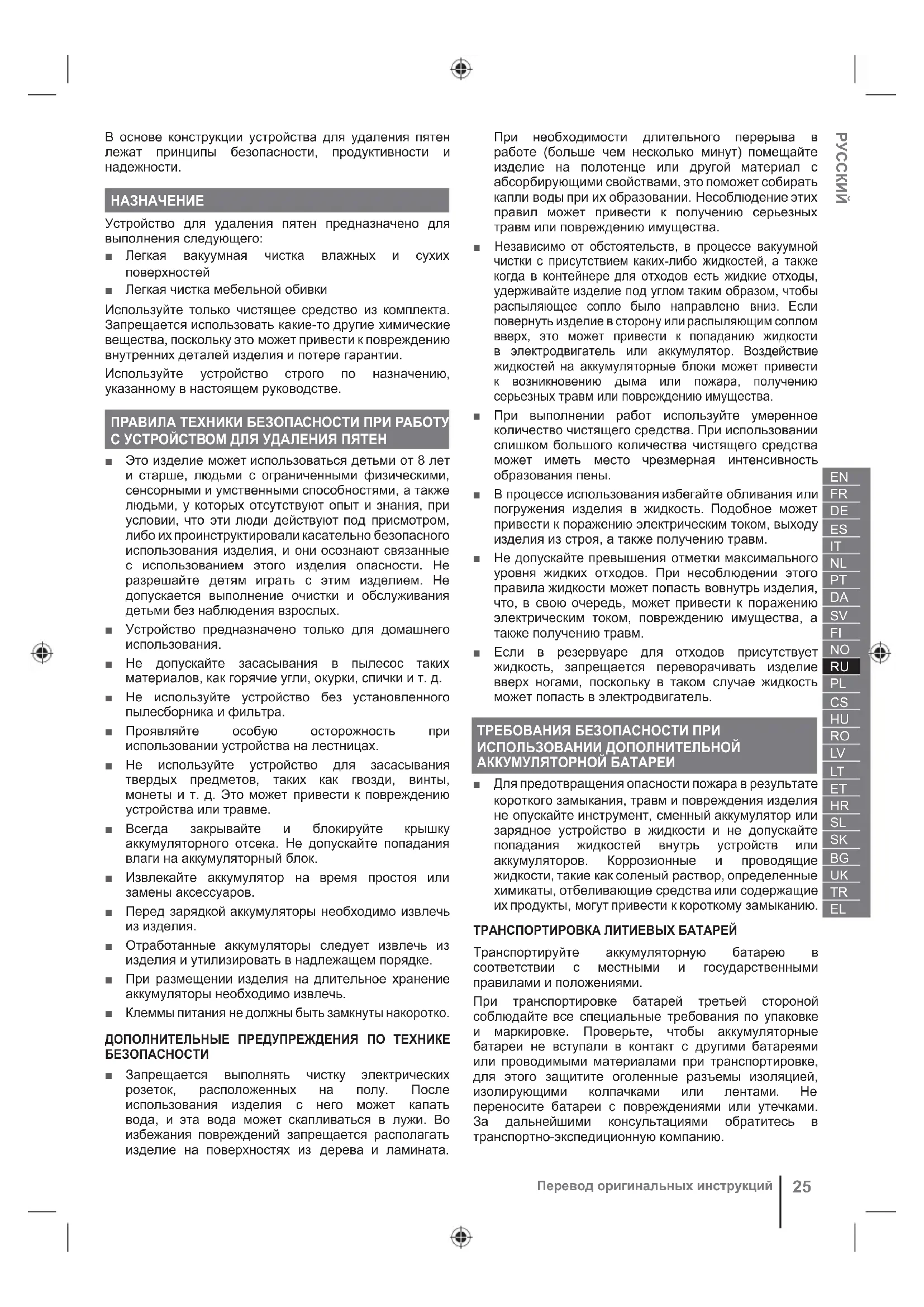 Устройство для удаления пятен предназначено для выполнения следующего: ■ Легкая вакуумная чистка влажных и сухих поверхностей ■ Легкая чистка мебельной обивки Используйте только чистящее средство из комплекта. Запрещается использовать какие-то другие химические вещества, поскольку это может привести к повреждению внутренних деталей изделия и потере гарантии. Используйте устройство строго по назначению, указанному в настоящем руководстве. ПРАВИЛА ТЕХНИКИ БЕЗОПАСНОСТИ ПРИ РАБОТУ С УСТРОЙСТВОМ ДЛЯ УДАЛЕНИЯ ПЯТЕН ■ Это изделие может использоваться детьми от 8 лет и старше, людьми с ограниченными физическими, сенсорными и умственными способностями, а также людьми, у которых отсутствуют опыт и знания, при условии, что эти люди действуют под присмотром, либо их проинструктировали касательно безопасного использования изделия, и они осознают связанные с использованием этого изделия опасности. Не разрешайте детям играть с этим изделием. Не допускается выполнение очистки и обслуживания детьми без наблюдения взрослых. ■ Устройство предназначено только для домашнего использования. ■ Не допускайте засасывания в пылесос таких материалов, как горячие угли, окурки, спички и т. д. ■ Не используйте устройство без установленного пылесборника и фильтра. ■ Проявляйте особую осторожность при использовании устройства на лестницах. ■ Не используйте устройство для засасывания твердых предметов, таких как гвозди, винты, монеты и т. д. Это может привести к повреждению устройства или травме. ■ Всегда закрывайте и блокируйте крышку аккумуляторного отсека. Не допускайте попадания влаги на аккумуляторный блок. ■ Извлекайте аккумулятор на время простоя или замены аксессуаров. ■ Перед зарядкой аккумуляторы необходимо извлечь из изделия. ■ Отработанные аккумуляторы следует извлечь из изделия и утилизировать в надлежащем порядке. ■ При размещении изделия на длительное хранение аккумуляторы необходимо извлечь. ■ Клеммы питания не должны быть замкнуты накоротко. ДОПОЛНИТЕЛЬНЫЕ ПРЕДУПРЕЖДЕНИЯ ПО ТЕХНИКЕ БЕЗОПАСНОСТИ ■ Запрещается выполнять чистку электрических розеток, расположенных на полу. После использования изделия с него может капать вода, и эта вода может скапливаться в лужи. Во избежания повреждений запрещается располагать изделие на поверхностях из дерева и ламината. При необходимости длительного перерыва в работе (больше чем несколько минут) помещайте изделие на полотенце или другой материал с абсорбирующими свойствами, это поможет собирать капли воды при их образовании. Несоблюдение этих правил может привести к получению серьезных травм или повреждению имущества. ■ Независимо от обстоятельств, в процессе вакуумной чистки с присутствием каких-либо жидкостей, а также когда в контейнере для отходов есть жидкие отходы, удерживайте изделие под углом таким образом, чтобы распыляющее сопло было направлено вниз. Если повернуть изделие в сторону или распыляющим соплом вверх, это может привести к попаданию жидкости в электродвигатель или аккумулятор. Воздействие жидкостей на аккумуляторные блоки может привести к возникновению дыма или пожара, получению серьезных травм или повреждению имущества. ■ При выполнении работ используйте умеренное количество чистящего средства. При использовании слишком большого количества 