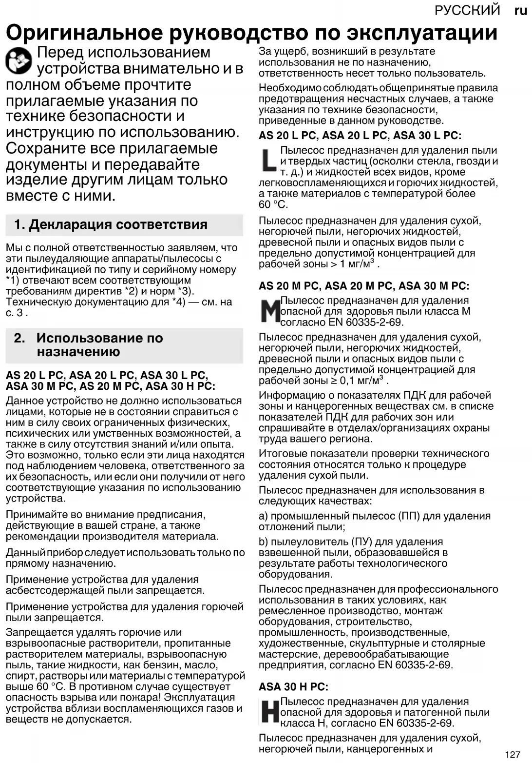 прибор следует использовать только по прямому назначению. Применение устройства для удаления асбестсодержащей пыли запрещается. Применение устройства для удаления горючей пыли запрещается. Запрещается удалять горючие или взрывоопасные растворители, пропитанные растворителем материалы, взрывоопасную пыль, такие жидкости, как бензин, масло, спирт, растворы или материалы с температурой выше 60 °C. В противном случае существует опасность взрыва или пожара! Эксплуатация устройства вблизи воспламеняющихся газов и веществ не допускается. За ущерб, возникший в результате использования не по назначению, ответственность несет только пользователь. Необходимо соблюдать общепринятые правила предотвращения несчастных случаев, а также указания по технике безопасности, приведенные в данном руководстве. AS 20 L PC, ASA 20 L PC, ASA 30 L PC: Пылесос предназначен для удаления пыли и твердых частиц (осколки стекла, гвозди и т. д.) и жидкостей всех видов, кроме легковоспламеняющихся и горючих жидкостей, а также материалов с температурой более 60 °C. Пылесос предназначен для удаления сухой, негорючей пыли, негорючих жидкостей, древесной пыли и опасных видов пыли с предельно допустимой концентрацией для рабочей зоны > 1 мг/м³ . AS 20 M PC, ASA 20 M PC, ASA 30 M PC: Пылесос предназначен для удаления опасной для здоровья пыли класса M согласно EN 60335-2-69. Пылесос предназначен для удаления сухой, негорючей пыли, негорючих жидкостей, древесной пыли и опасных видов пыли с предельно допустимой концентрацией для рабочей зоны ≥ 0,1 мг/м³ . Информацию о показателях ПДК для рабочей зоны и канцерогенных веществах см. в списке показателей ПДК для рабочих зон или спрашивайте в отделах/организациях охраны труда вашего региона. Итоговые показатели проверки технического состояния относятся только к процедуре удаления сухой пыли. Пылесос предназначен для использования в следующих качествах: a) промышленный пылесос (ПП) для удаления отложений пыли; b) пылеуловитель (ПУ) для удаления взвешенной пыли, образовавшейся в результате работы технологического оборудования. Пылесос предназначен для профессионального использования в таких условиях, как ремесленное производство, монтаж оборудования, строительство, промышленность, производственные, художественные, скульптурные и столярные мастерские, деревообрабатывающие предприятия, согласно EN 60335-2-69. ASA 30 H PC: Пылесос предназначен для удаления опасной для здоровья и патогенной пыли класса Н, согласно EN 60335-2-69. Пылесос предназначен для удаления сухой, негорючей пыли, канцерогенных и