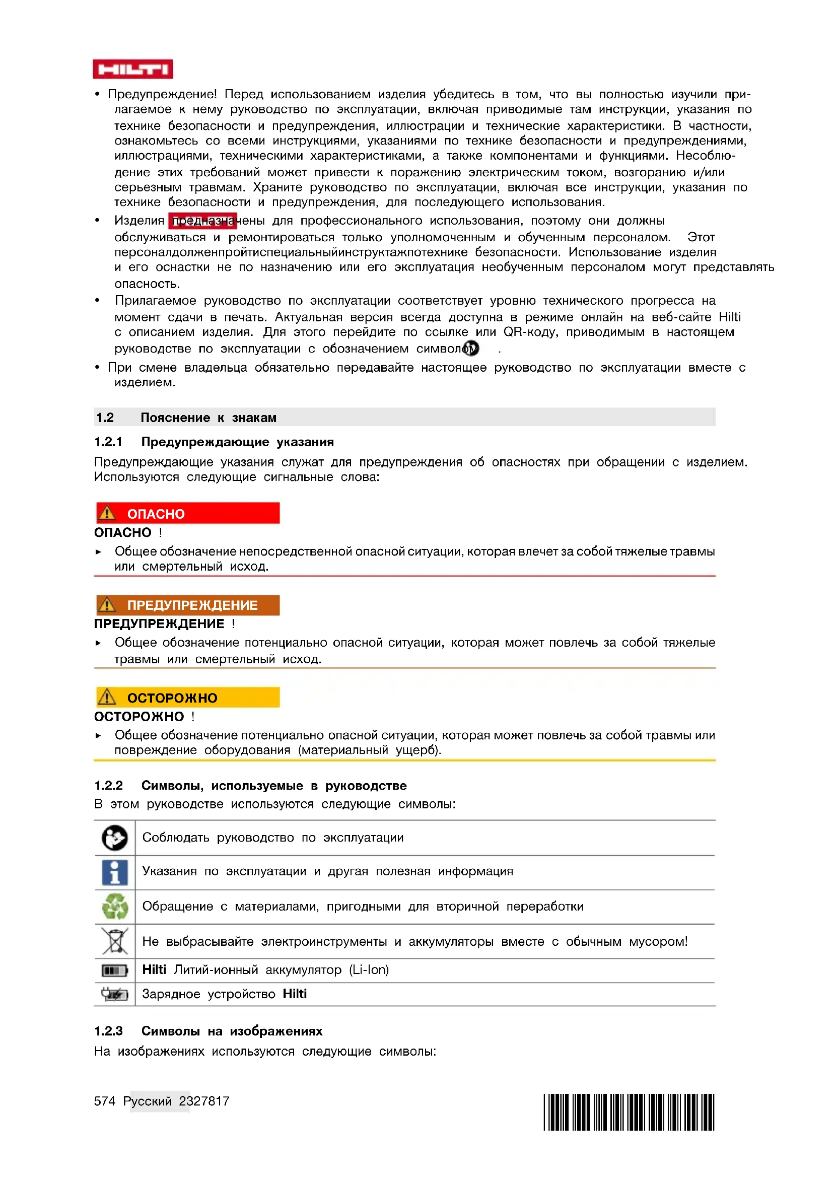 В этом руководстве используются следующие символы: Соблюдать руководство по эксплуатации Указания по эксплуатации и другая полезная информация Обращение с материалами, пригодными для вторичной переработки Не выбрасывайте электроинструменты и аккумуляторы вместе с обычным мусором! Hilti Литий-ионный аккумулятор (Li-Ion) Зарядное устройство Hilti