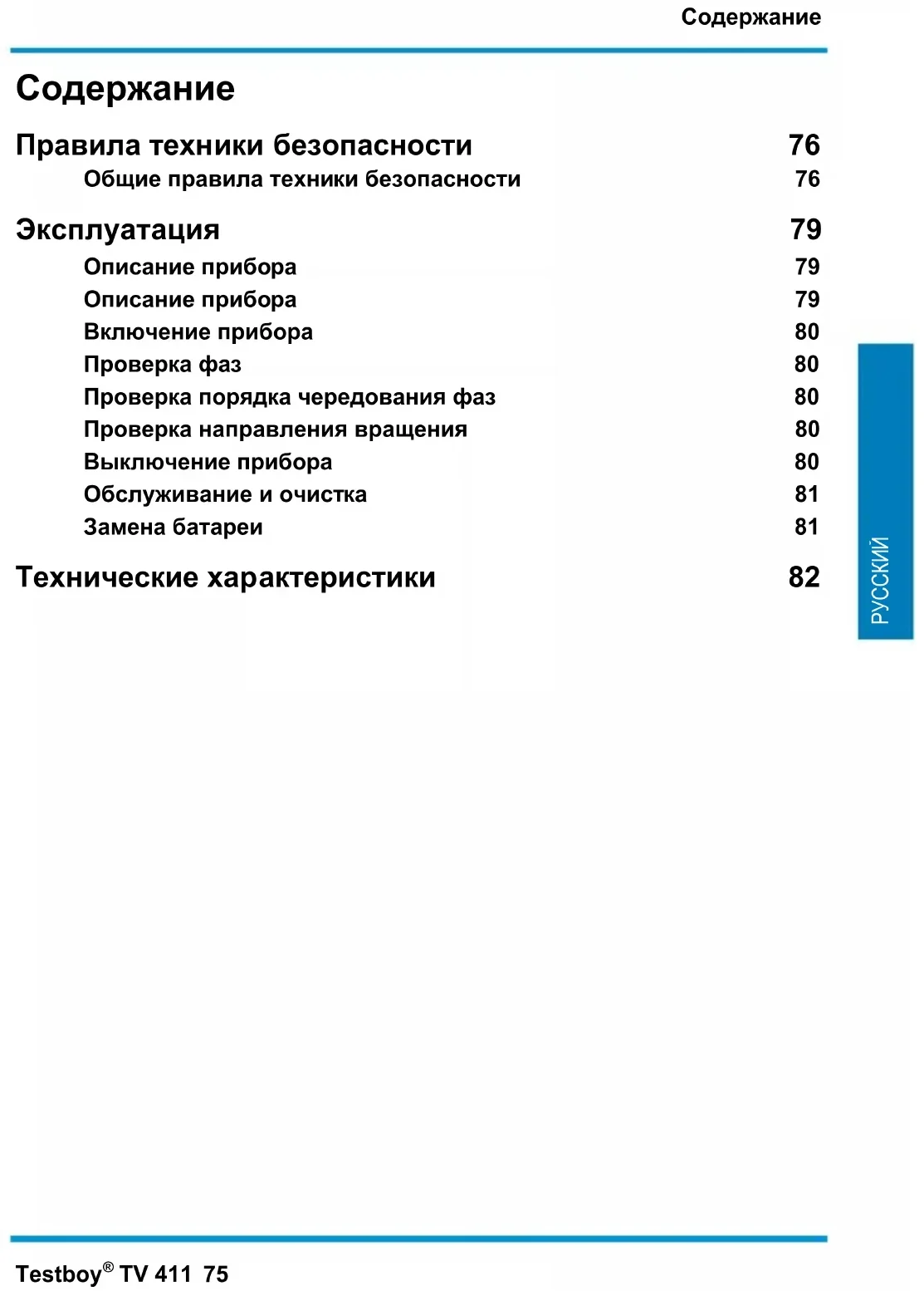 Правила техники безопасности 76 Общие правила техники безопасности 76 Эксплуатация 79 Описание прибора 79 Описание прибора 79 Включение прибора 80 Проверка фаз 80 Проверка порядка чередования фаз 80 Проверка направления вращения 80 Выключение прибора 80 Обслуживание и очистка 81 Замена батареи 81 Технические характеристики 82Правила техники безопасности 76 Testboy