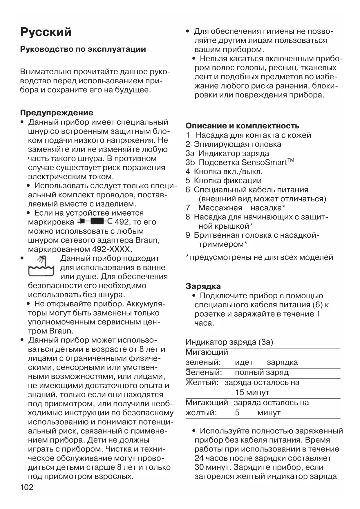 Продукт содержит аккумуляторы и/или перерабатываемые отходы электрического оборудования. В целях защиты окружающей среды не выбрасывайте изделие вме- сте с бытовыми отходами. Передайте его в пункты сбора отходов электриче- ского оборудования в вашей стране. В изделие могут быть внесены измене- ния без предварительного уведомления. Электрический эпилятор Braun тип 5391 с сетевым блоком питания тип 492-XXXX. Если на прибор нанесена маркировка 492, его можно использовать со всеми источниками питания Braun с марки- ровкой 492-XXXX. Тип 492-XXXX источ- ника питания означает, что использо- вать можно только источники питания Braun с маркировкой 492-XXXX. Источ- ники питания типа 492-XXXX представ- ляют собой серию источников питания с одинаковыми электротехническими характеристиками; вместо букв «X» могут быть цифры от 0 до 9: они используются для внутренней диффе- ренциации производителя. Дополни-106 тельная информация представлена на типовой табличке на источнике пита-
