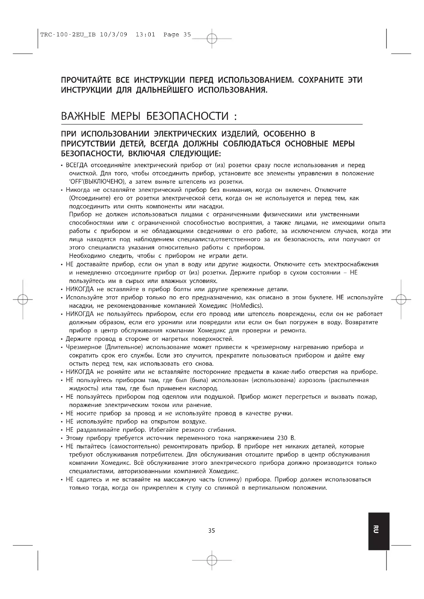 - НЕ садитесь и не вставайте на массажную часть (спинку) прибора. Прибор должен использоваться только тогда, когда он прикреплен к стулу со спинкой в вертикальном положении. TRC-100-2EU_IB 10/3/09 13:01 Page 3536