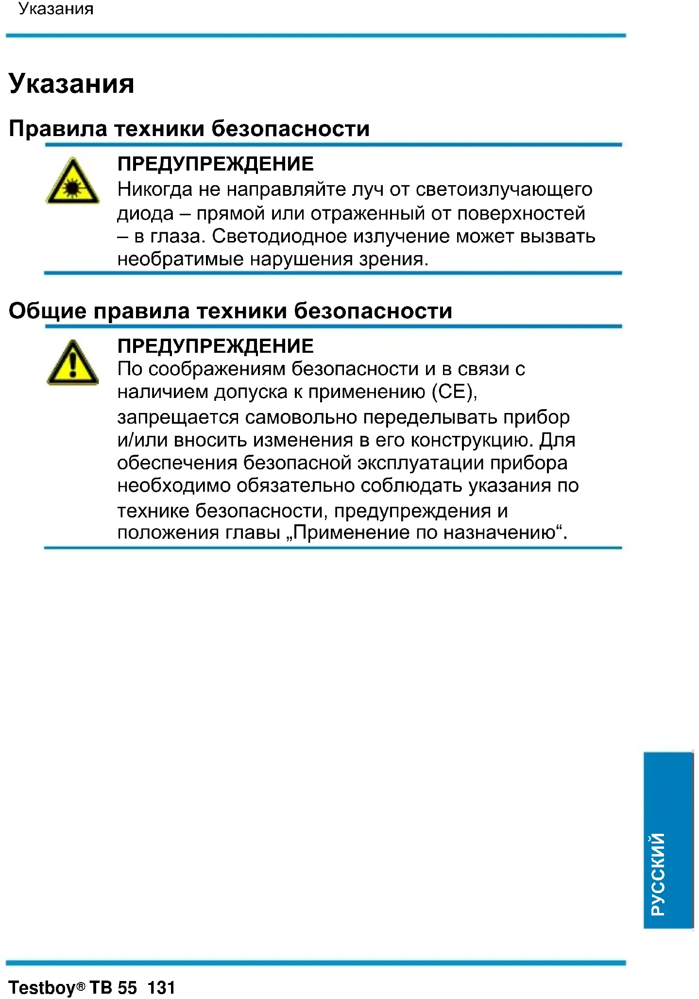 ПРЕДУПРЕЖДЕНИЕ По соображениям безопасности и в связи с наличием допуска к применению (CE), запрещается самовольно переделывать прибор и/или вносить изменения в его конструкцию. Для обеспечения безопасной эксплуатации прибора необходимо обязательно соблюдать указания по технике безопасности, предупреждения и положения главы „Применение по назначению“.Указания 132 Testboy