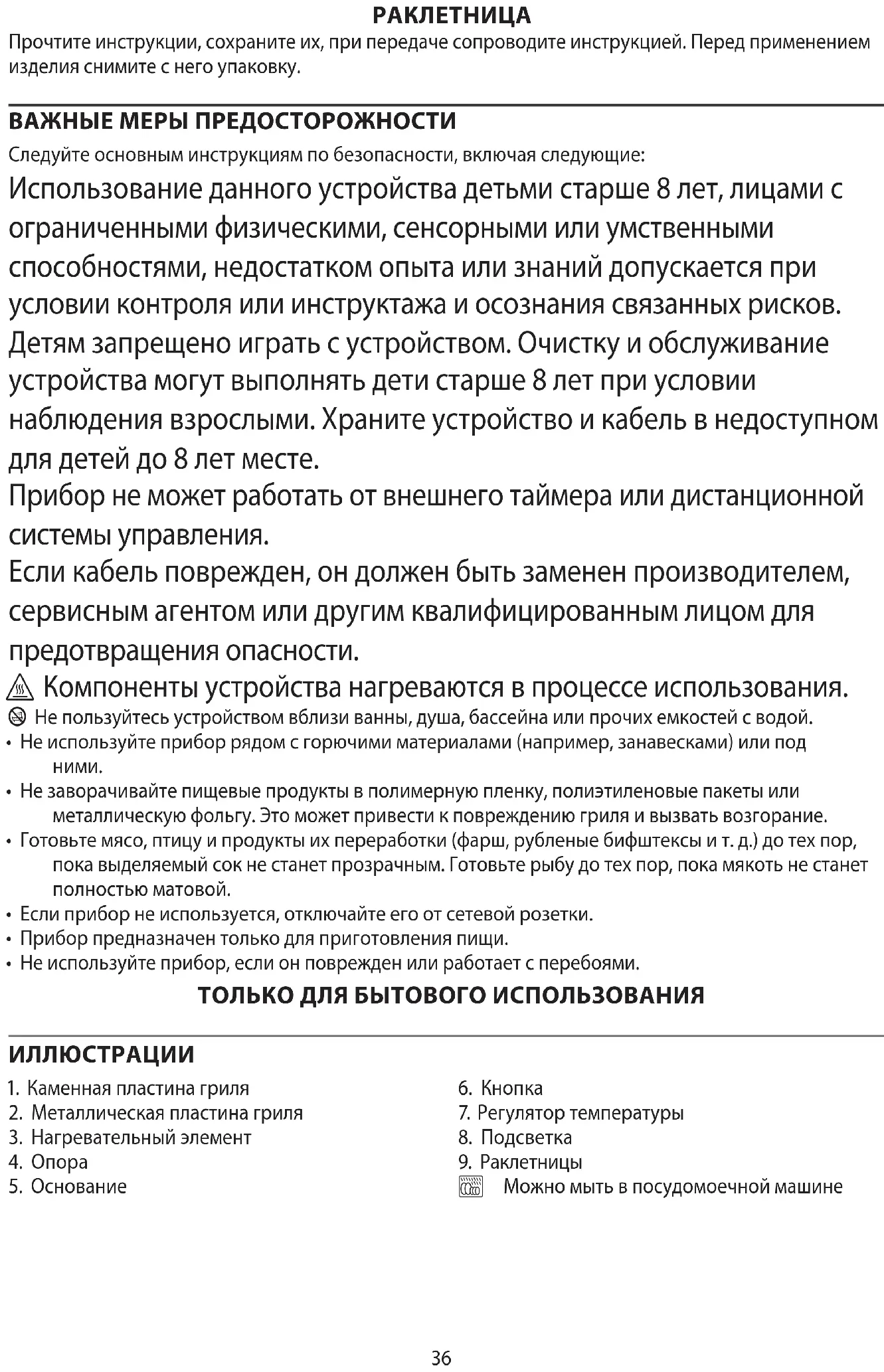 - Не используйте прибор, если он поврежден или работает с перебоями. ТОЛЬКО ДЛЯ БЫТОВОГО ИСПОЛЬЗОВАНИЯ ИЛЛЮСТРАЦИИ