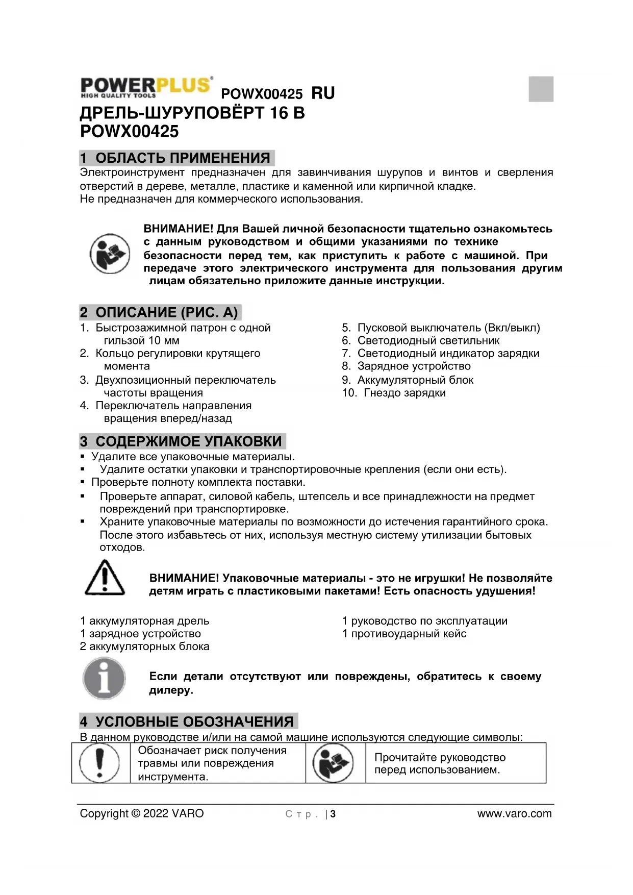 Прочитайте руководство перед использованием.POWX00425 RU Copyright © 2022 VARO С т р . | 4 www.varo.com