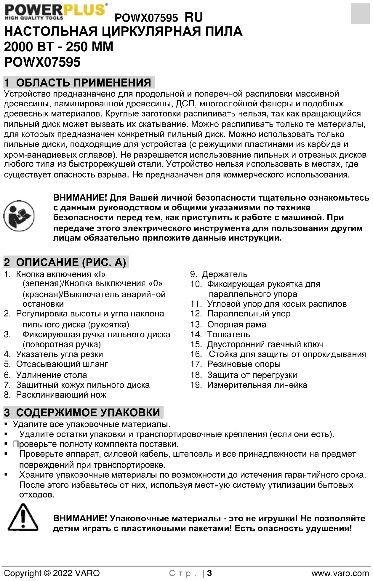 ВНИМАНИЕ! Упаковочные материалы - это не игрушки! Не позволяйте детям играть с пластиковыми пакетами! Есть опасность удушения!POWX07595 RU Copyright © 2022 VARO С т р . | 4 www.varo.com Настольная циркулярная пила 2000 Вт Установленный пильный