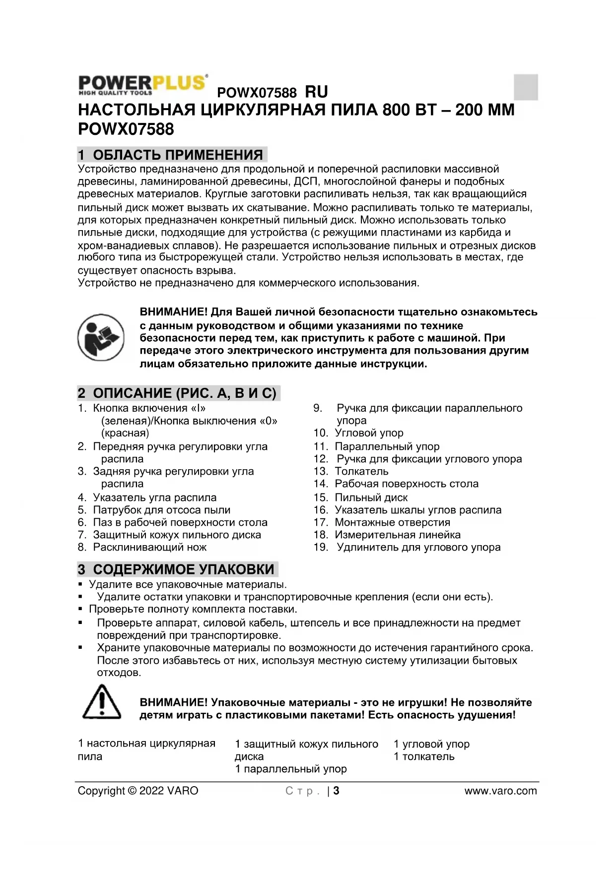 1 параллельный упор 1 угловой упор 1 толкательPOWX07588 RU Copyright © 2022 VARO С т р . | 4 www.varo.com 1 руководство по эксплуатации 2 гаечных ключа 1 пильный диск (установленный на