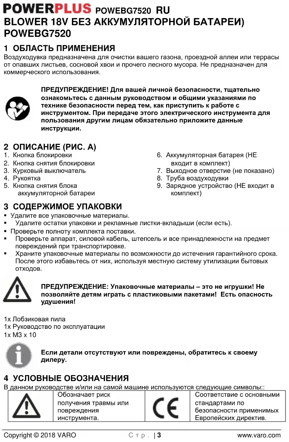 - 17 ДЕКЛАРАЦИЯ О СООТВЕТСТВИИ POWEBG7520 RU Copyright © 2018 VARO С т р . | 3 www.varo.com BLOWER 18V БЕЗ АККУМУЛЯТОРНОЙ БАТАРЕИ) POWEBG7520 1 ОБЛАСТЬ ПРИМЕНЕНИЯ Воздуходувка предназначена для очистки вашего газона, проездной аллеи или террасы от опавших листьев, сосновой хвои и прочего лесного мусора. Не предназначен для коммерческого использования. ПРЕДУПРЕЖДЕНИЕ! Для вашей личной безопасности, тщательно ознакомьтесь с данным руководством и общими указаниями по технике безопасности перед тем, как приступить к работе с инструментом. При передаче этого электрического инструмента для пользования другим лицам обязательно приложите данные инструкции. 2 ОПИСАНИЕ (РИС. А) p. 12