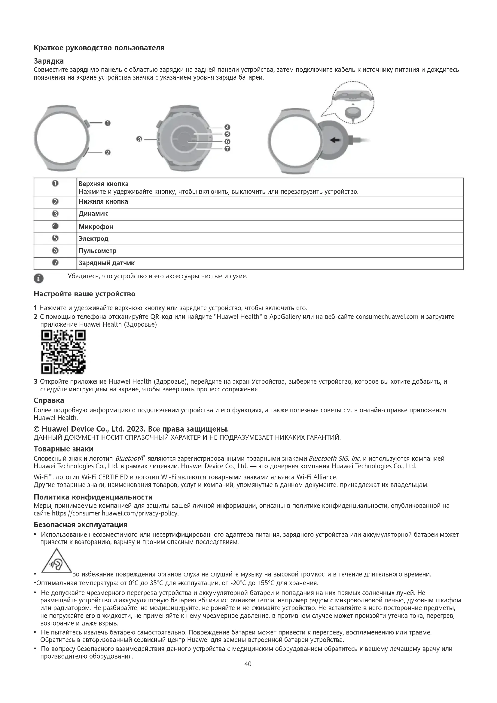 Более подробную информацию о подключении устройства и его функциях, а также полезные советы см. в онлайн-справке приложения Huawei Health. © Huawei Device Co., Ltd. 2023. Все права защищены. ДАННЫЙ ДОКУМЕНТ НОСИТ СПРАВОЧНЫЙ ХАРАКТЕР И НЕ ПОДРАЗУМЕВАЕТ НИКАКИХ ГАРАНТИЙ. Товарные знаки Словесный знак и логотип Bluetooth