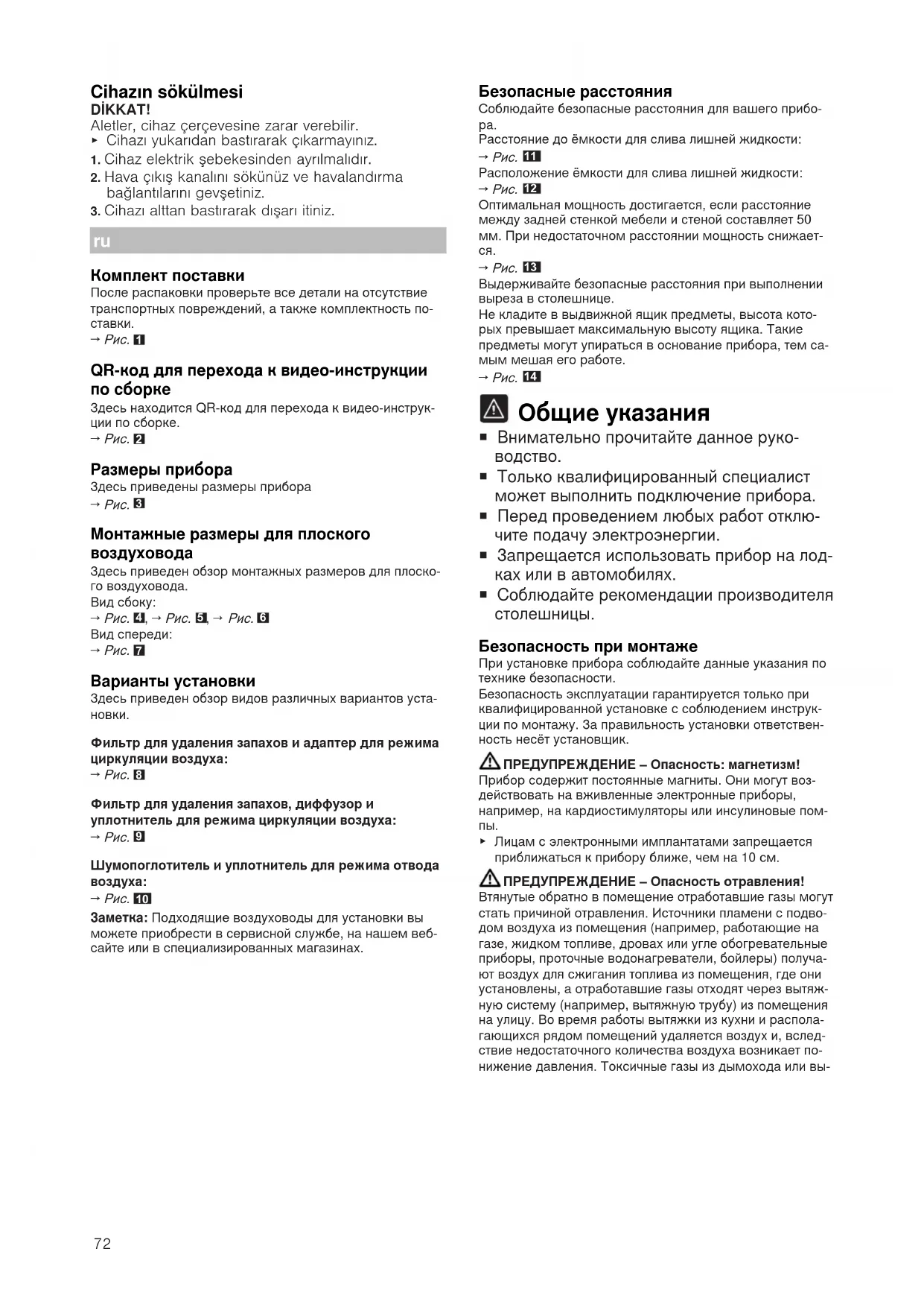 ¡ Только квалифицированный специалист может выполнить подключение прибора. ¡ Перед проведением любых работ отклю- чите подачу электроэнергии. ¡ Запрещается использовать прибор на лод- ках или в автомобилях. ¡ Соблюдайте рекомендации производителя столешницы. Безопасность при монтаже При установке прибора соблюдайте данные указания потехнике безопасности.Безопасность эксплуатации гарантируется только приквалифицированной установке с соблюдением инструк-ции по монтажу. За правильность установки ответствен-ность несёт установщик.ПРЕДУПРЕЖДЕНИЕ‒Опасность: магнетизм!Прибор содержит постоянные магниты. Они могут воз-действовать на вживленные электронные приборы,например, на кардиостимуляторы или инсулиновые пом- ▶ Лицам с электронными имплантатами запрещаетсяприближаться к прибору ближе, чем на 10см.ПРЕДУПРЕЖДЕНИЕ‒Опасность отравления!Втянутые обратно в помещение отработавшие газы могутстать причиной отравления. Источники пламени с подво-дом воздуха из помещения (например, работающие нагазе, жидком топливе, дровах или угле обогревательныеприборы, проточные водонагреватели, бойлеры) получа-ют воздух для сжигания топлива из помещения, где ониустановлены, а отработавшие газы отходят через вытяж-ную систему (например, вытяжную трубу) из помещенияна улицу. Во время работы вытяжки из кухни и распола-гающихся рядом помещений удаляется воздух и, вслед-ствие недостаточного количества воздуха возникает по-нижение давления. Токсичные газы из дымохода или вы-73 тяжного канала всасываются обратно в жилые помеще-