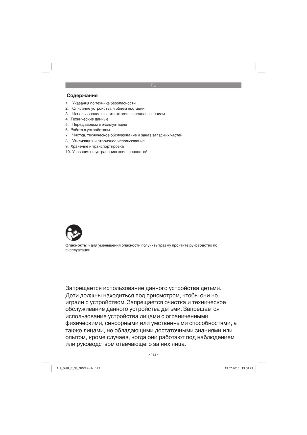 Запрещается использование данного устройства детьми. Дети должны находиться под присмотром, чтобы они не играли с устройством. Запрещается очистка и техническое обслуживание данного устройства детьми. Запрещается использование устройства лицами с ограниченными физическими, сенсорными или умственными способностями, а также лицами, не обладающими достаточными знаниями или опытом, кроме случаев, когда они работают под наблюдением или руководством отвечающего за них лица. Опасность! - для уменьшения опасности получить травму прочтите руководство по эксплуатации Anl_GHR_E_38_SPK7.indb 122Anl_GHR_E_38_SPK7.indb 122 19.07.2016 13:08:2319.07.2016 13:08:23RU