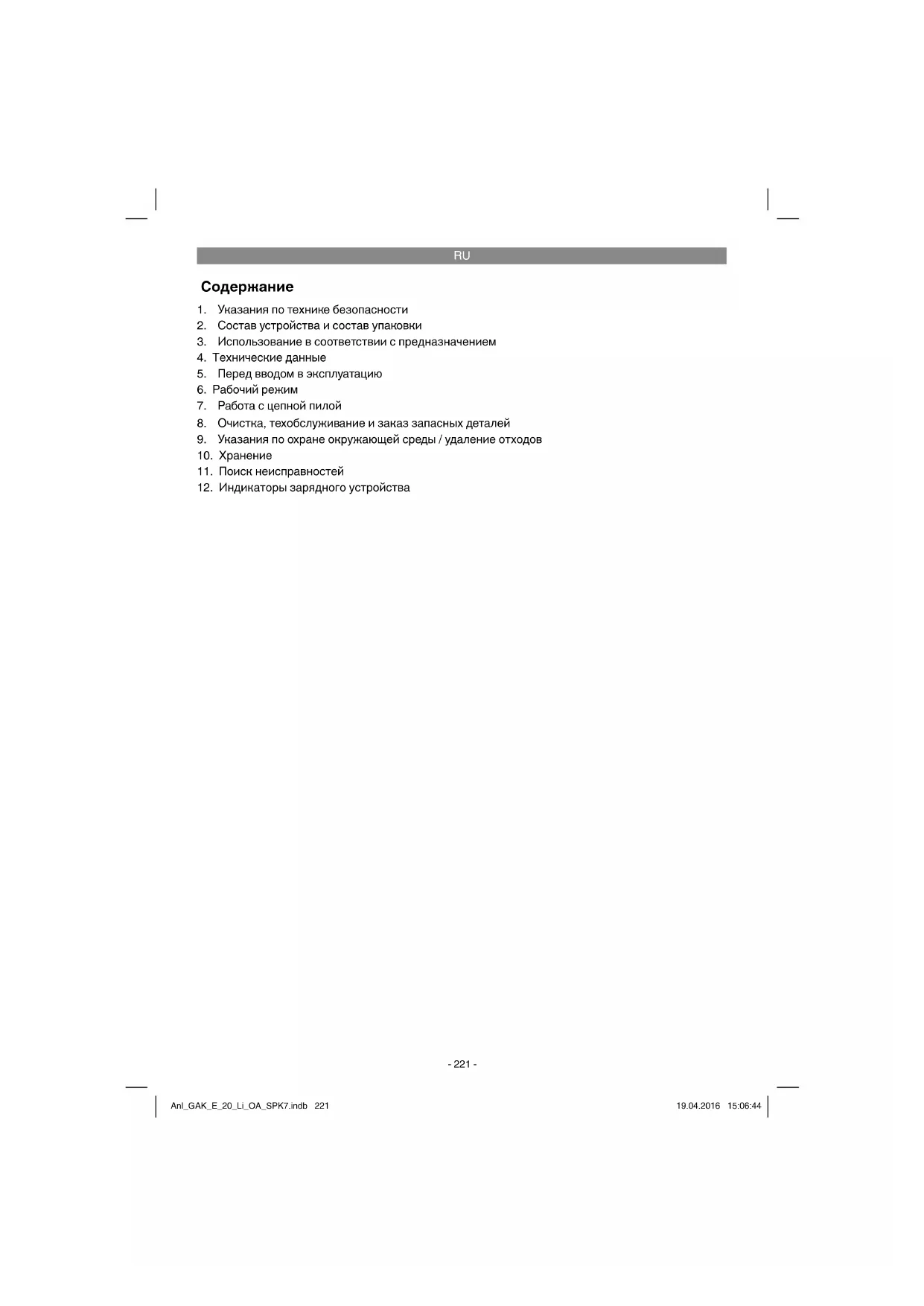 Если Вы не пользуетесь цепной пилой в течении длительного времени, то удалите масло цепи из бака. Окуните пильную цепь и лезвие коротко в масляную ванну и заверните их затем в промасленную Anl_GAK_E_20_Li_OA_SPK7.indb 228Anl_GAK_E_20_Li_OA_SPK7.indb 228 19.04.2016 15:06:4519.04.2016 15:06:45RU