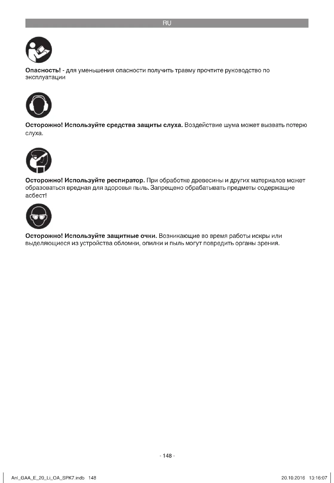 с предназначением Универсальная электропила предназначена для пиления древесины, железа, цветных металлов и пластмассы при использовании соответствующего пильного полотна. Разрешается использовать устройство только в соответствии с его предназначением. Любое другое, отличающееся от этого использование считается не соответствующим предназначению. За все возникшие в результате такого использования ущерб или Anl_GAA_E_20_Li_OA_SPK7.indb 149Anl_GAA_E_20_Li_OA_SPK7.indb 149 20.10.2016 13:16:0720.10.2016 13:16:07RU