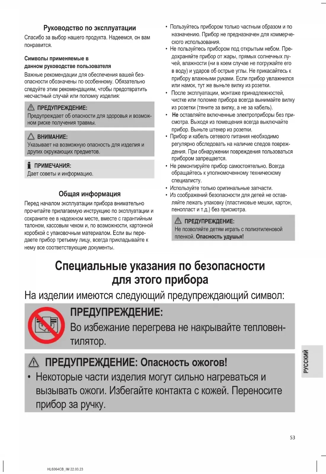 - Некоторые части изделия могут сильно нагреваться и вызывать ожоги. Избегайте контакта с кожей. Переносите прибор за ручку.HL6064CB_IM 22.03.23