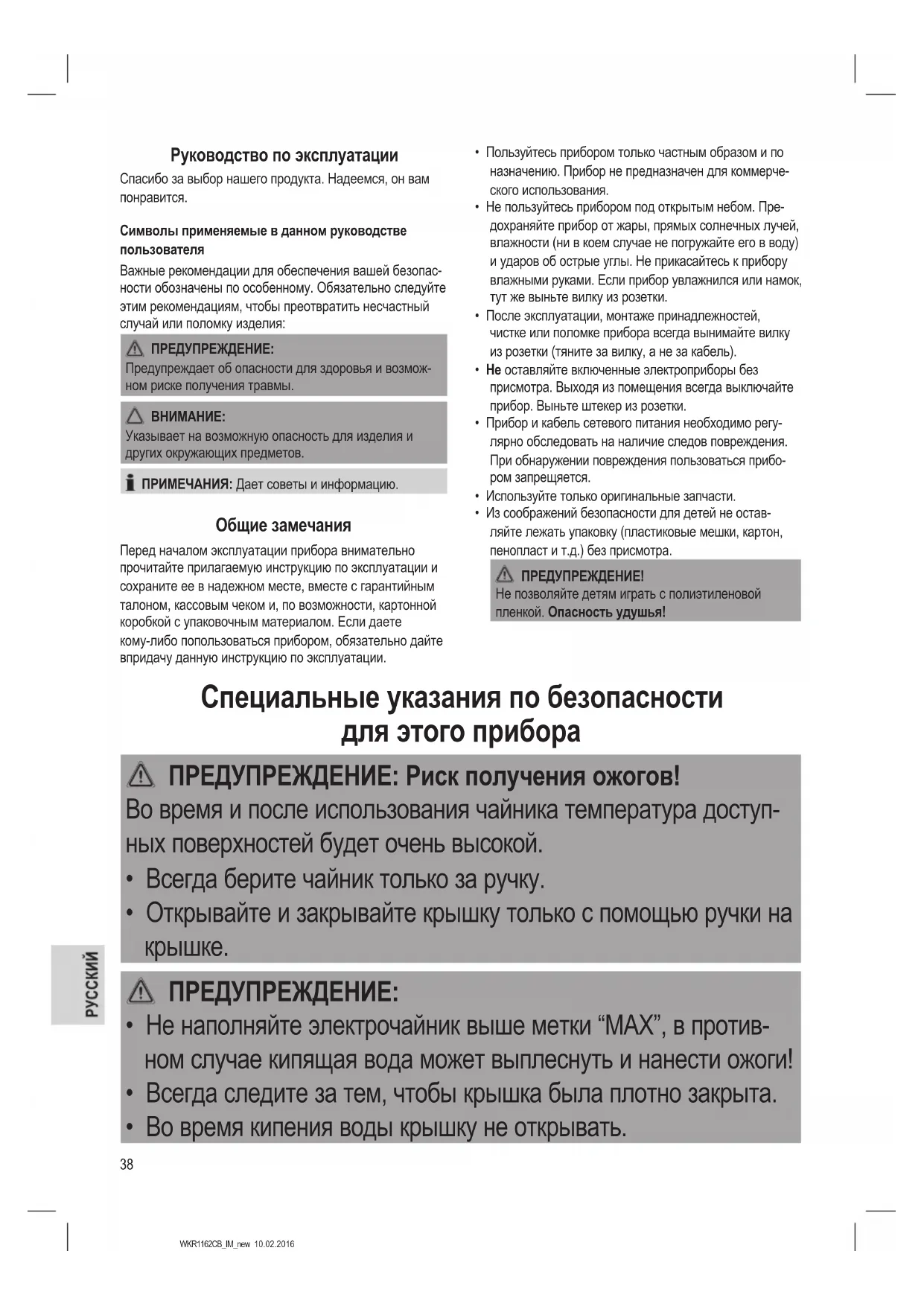 - Из соображений безопасности для детей не остав- ляйте лежать упаковку (пластиковые мешки, картон, пенопласт и т.д.) без присмотра. ПРЕДУПРЕЖДЕНИЕ! Не позволяйте детям играть с полиэтиленовой пленкой. Опасность удушья! Специальные указания по безопасности для этого прибора ПРЕДУПРЕЖДЕНИЕ: Риск получения ожогов! Во время и после использования чайника температура доступ- ных поверхностей будет очень высокой.