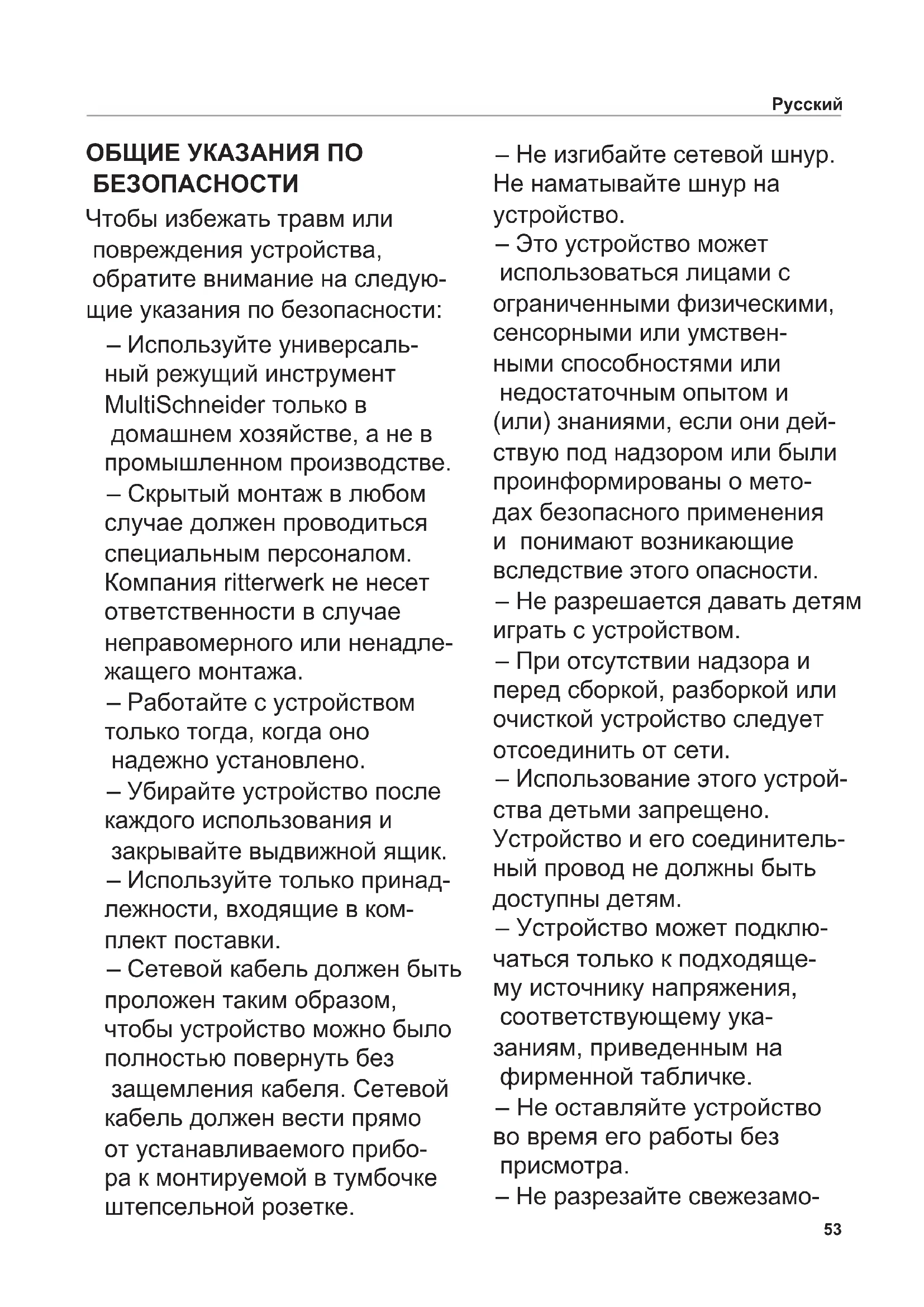 Ta naprava je skladna z nasle- dnjimi direktivami in uredbami: – 2004/108/ES – 2006/95/ES – 1935/2004/ES – EuP 2009/125/ES – 2011/65/EU Naprava je zato skladna s CE-predpisi. Omrežna napetost/moč: glejte tipsko ploščico na spodnji strani naprave Debelina rezanja: 0 mm do približno 14 mm GARANCIJA Za to ritter napravo nudimo 2-letno garancijo proizvajalca, računano od datuma nakupa in v skladu s smernicami EU o jamstvu.Prosimo, da v pri- meru garancije in popravila na- pravo načelno pošljete deželno specičnim servisnim službam! Slovenščina53 ОБЩИЕ УКАЗАНИЯ ПО БЕЗОПАСНОСТИ Чтобы избежать травм или повреждения устройства, обратите внимание на следую- щие указания по безопасности: – Используйте универсаль- ный режущий инструмент MultiSchneider только в домашнем хозяйстве, а не в промышленном производстве. – Скрытый монтаж в любом случае должен проводиться специальным персоналом. Компания ritterwerk не несет ответственности в случае неправомерного или ненадле- жащего монтажа. – Работайте с устройством только тогда, когда оно надежно установлено. – Убирайте устройство после каждого использования и закрывайте выдвижной ящик. – Используйте только принад- лежности, входящие в ком- плект поставки. – Сетевой кабель должен быть проложен таким образом, чтобы устройство можно было полностью повернуть без защемления кабеля. Сетевой кабель должен вести прямо от устанавливаемого прибо- ра к монтируемой в тумбочке штепсельной розетке. – Не изгибайте сетевой шнур. Не наматывайте шнур на устройство. – Это устройство может использоваться лицами с ограниченными физическими, сенсорными или умствен- ными способностями или недостаточным опытом и (или) знаниями, если они дей- ствую под надзором или были проинформированы о мето- дах безопасного применения и понимают возникающие вследствие этого опасности. – Не разрешается давать детям играть с устройством. – При отсутствии надзора и перед сборкой, разборкой или очисткой устройство следует отсоединить от сети. – Использование этого устрой- ства детьми запрещено. Устройство и его соединитель- ный провод не должны быть доступны детям. – Устройство может подклю- чаться только к подходяще- му источнику напряжения, соответствующему ука- заниям, приведенным на фирменной табличке. – Не оставляйте устройство во время его работы без