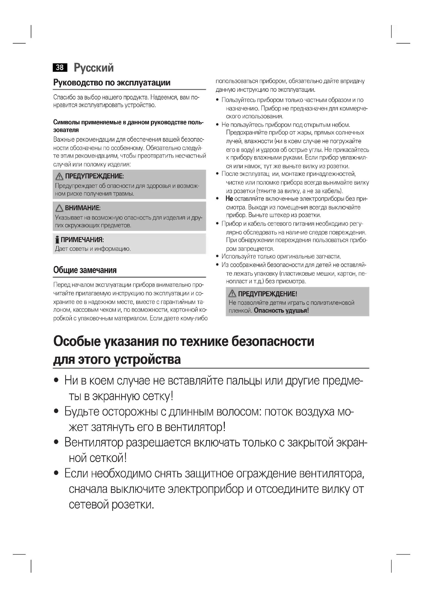 - Не оставляйте включенные электроприборы без при- смотра. Выходя из помещения всегда выключайте прибор. Выньте штекер из розетки.• Прибор и кабель сетевого питания необходимо регу-лярно обследовать на наличие следов повреждения. При обнаружении повреждения пользоваться прибо-ром запрещяется.• Используйте только оригинальные запчасти.• Из соображений безопасности для детей не оставляй-те лежать упаковку (пластиковые мешки, картон, пе-нопласт и т.д.) без присмотра. ПРЕДУПРЕЖДЕНИЕ! Не позволяйте детям играть с полиэтиленовой пленкой. Опасность удушья! Особые указания по технике безопасности для этого устройства