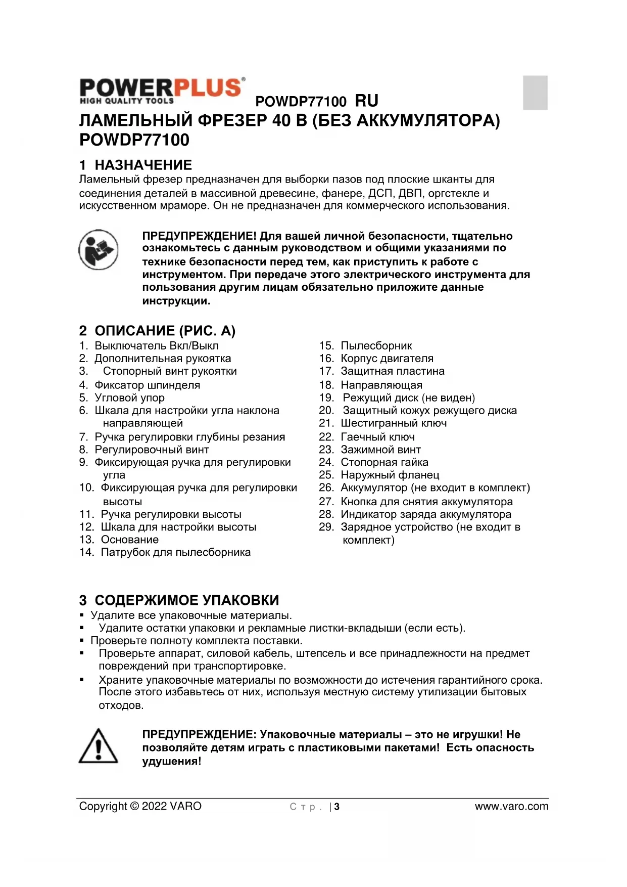 - 18 ДЕКЛАРАЦИЯ О СООТВЕТСТВИИ POWDP77100 RU Copyright © 2022 VARO С т р . | 3 www.varo.com ЛАМЕЛЬНЫЙ ФРЕЗЕР 40 B (БЕЗ АККУМУЛЯТОРА) POWDP77100 1 НАЗНАЧЕНИЕ Ламельный фрезер предназначен для выборки пазов под плоские шканты для соединения деталей в массивной древесине, фанере, ДСП, ДВП, оргстекле и искусственном мраморе. Он не предназначен для коммерческого использования. ПРЕДУПРЕЖДЕНИЕ! Для вашей личной безопасности, тщательно ознакомьтесь с данным руководством и общими указаниями по технике безопасности перед тем, как приступить к работе с инструментом. При передаче этого электрического инструмента для пользования другим лицам обязательно приложите данные инструкции. 2 ОПИСАНИЕ (РИС. A) p. 14