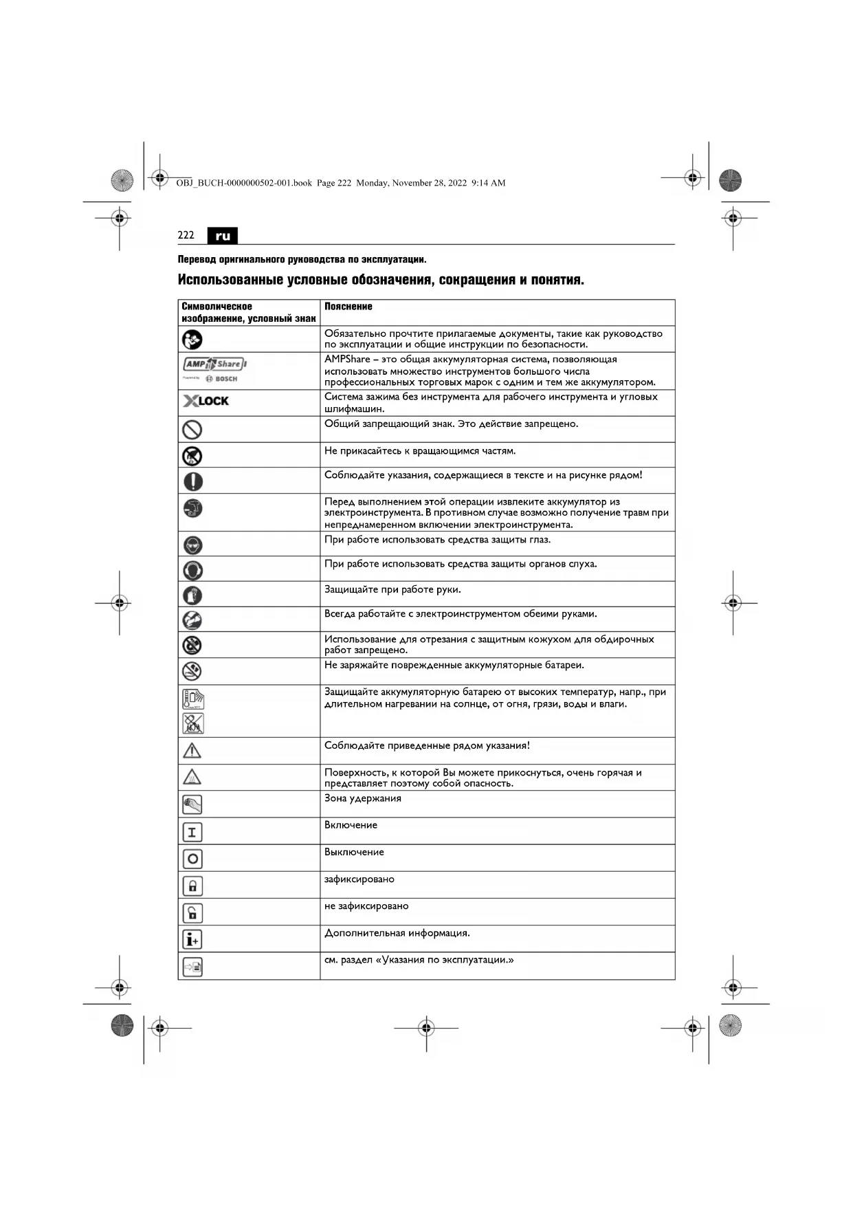 – При применении защитного кожуха типа A или типа B для отрезания или бокового шлифования в бетоне или каменной кладке повышается риск воздействия пыли, а также утраты контроля над инструментом в результате обратного удара. – При применении защитного кожуха типа A или типа B с тарельчатой щеткой, которая превышает указанную толщину, проволоки могут сталкиваться с защитным кожухом, что может привести к поломке проволоки. При использовании комбинированных шлифовальных и отрезных шлифовальных кругов должен применяться защитный кожух для резки (тип A). Не направляйте электроинструмент на себя, других лиц и животных. Это чревато травмами от острых или горячих режущих или шлифовальных инструментов. Следите за скрытой электрической проводкой, газопроводом и водопроводом. До начала работы проверить рабочий участок, например, металлоискателем. Используйте стационарную вытяжную установку и регулярно продувайте вентиляционные щели. При работе в экстремальных условиях при обработке металлов внутри электроинструмента может откладываться токопроводящая пыль. Это может отрицательно повлиять на защитную изоляцию электроинструмента. Запрещается закреплять на электроинструменте таблички и обозначения с помощью винтов и заклепок. Поврежденная изоляция не защищает от поражения электрическим током. Работайте всегда с дополнительной рукояткой. Дополнительная рукоятка обеспечивает надежное ведение электроинструмента. После обработки содержащих гипс материалов: очищайте вентиляционные отверстия электроинструмента и переключающие элементы сухим сжатым воздухом, не содержащим масел. Если этого не делать, содержащая гипс пыль оседает в корпусе электроинструмента и на переключающих элементах и, соединяясь с влагой в воздухе, отвердевает. Это может привести к повреждению переключающего механизма. Использование и обращение с аккумуляторами (аккумуляторными блоками). Настоящие указания по технике безопасности касаются только литиево-ионных аккумуляторных батарей 18 В FEIN AMPShare. OBJ_BUCH-0000000502-001.book Page 227 Monday, November 28, 2022 9:14 AM228
