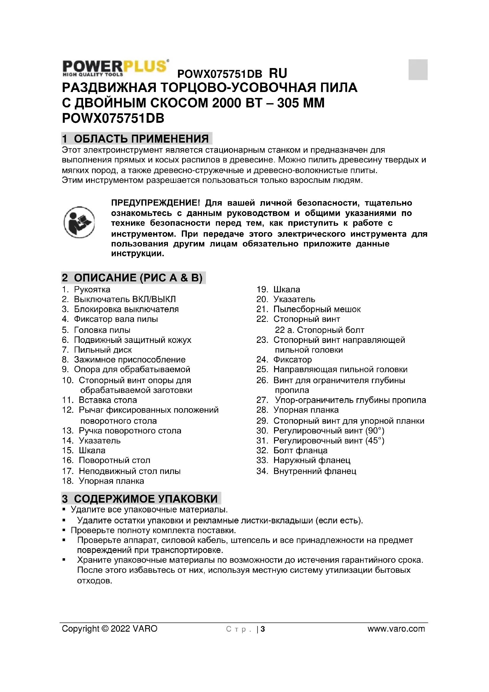 Copyright © 2022 VARO С т р . | 3 www.varo.com РАЗДВИЖНАЯ ТОРЦОВО-УСОВОЧНАЯ ПИЛА С ДВОЙНЫМ СКОСОМ 2000 ВТ – 305 MM POWX075751DB 1 ОБЛАСТЬ ПРИМЕНЕНИЯ Этот электроинструмент является стационарным станком и предназначен для выполнения прямых и косых распилов в древесине. Можно пилить древесину твердых и мягких пород, а также древесно-стружечные и древесно-волокнистые плиты. Этим инструментом разрешается пользоваться только взрослым людям. ПРЕДУПРЕЖДЕНИЕ! Для вашей личной безопасности, тщательно ознакомьтесь с данным руководством и общими указаниями по технике безопасности перед тем, как приступить к работе с инструментом. При передаче этого электрического инструмента для пользования другим лицам обязательно приложите данные инструкции. 2 ОПИСАНИЕ (РИС A & B)