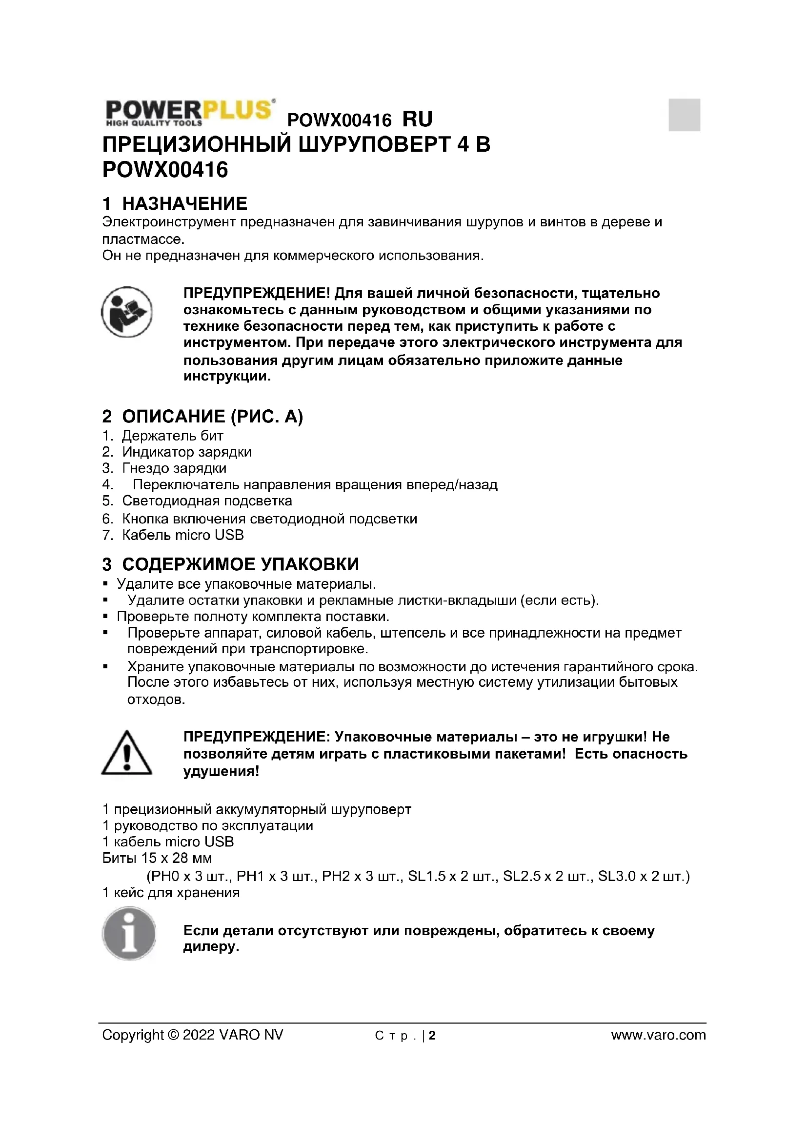 - 13 ДЕКЛАРАЦИЯ О СООТВЕТСТВИИ POWX00416 RU Copyright © 2022 VARO NV С т р . | 2 www.varo.com ПРЕЦИЗИОННЫЙ ШУРУПОВЕРТ 4 В POWX00416 1 НАЗНАЧЕНИЕ Электроинструмент предназначен для завинчивания шурупов и винтов в дереве и пластмассе. Он не предназначен для коммерческого использования. ПРЕДУПРЕЖДЕНИЕ! Для вашей личной безопасности, тщательно ознакомьтесь с данным руководством и общими указаниями по технике безопасности перед тем, как приступить к работе с инструментом. При передаче этого электрического инструмента для пользования другим лицам обязательно приложите данные инструкции. 2 ОПИСАНИЕ (РИС. A) p. 9