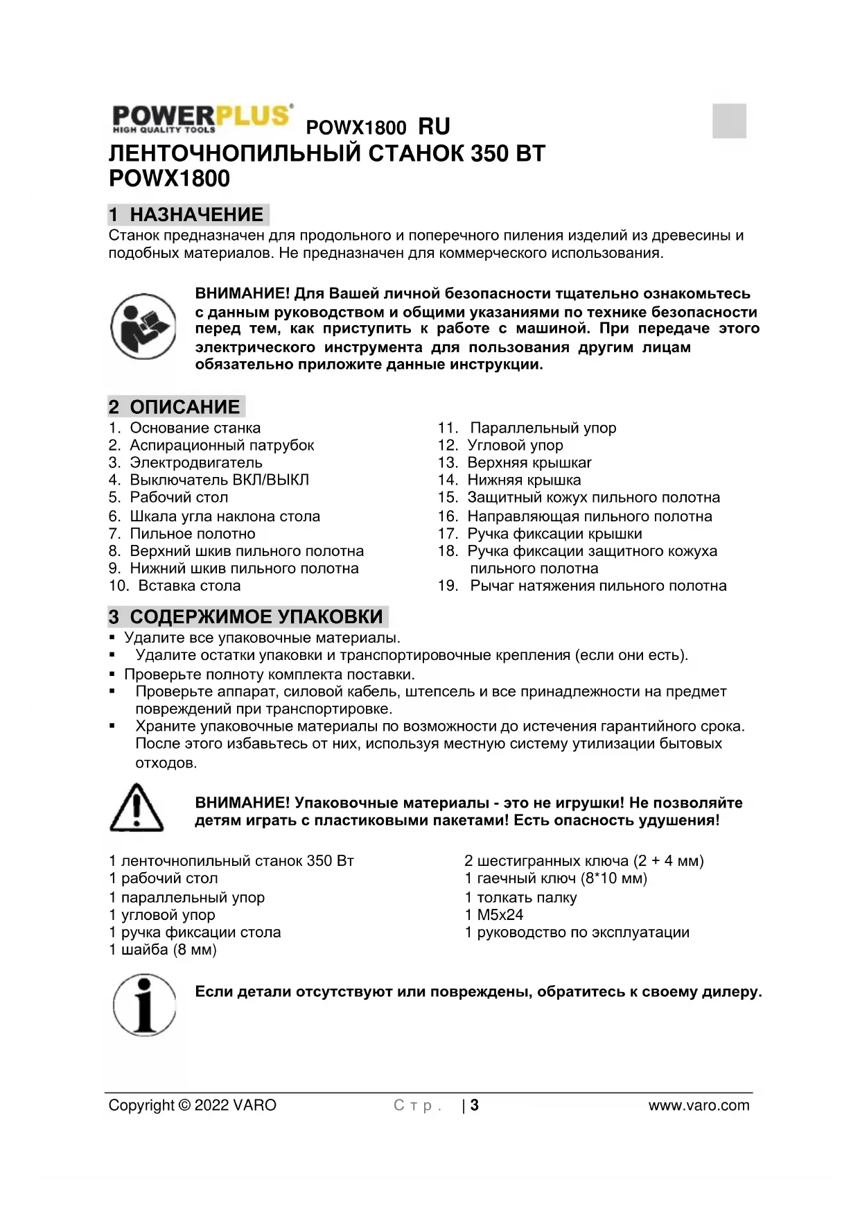 - Ваше устройство следует возвращать поставщику в неразобранном виде, в приемлемо чистом состоянии, (в оригинальной противоударной упаковке, если таковая у устройства имелась), приложив документ о покупке.POWX1800 RU Copyright © 2022 VARO С т р . | 15 www.varo.com 17 ОКРУЖАЮЩАЯ СРЕДА Если ваш аппарат требует замены после длительного использования, не выбрасывайте его вместе с домашним мусором, а используйте экологически безопасный способ для его утилизации. С отходами электрических машин нельзя поступать, как с обычными домашними отходами. Позаботьтесь об утилизации там, где для этого есть соответствующие установки. Проконсультируйтесь у местных органов власти или у продавца о возможности утилизации. 18 ДЕКЛАРАЦИЯ О СООТВЕТСТВИИ VARO N.V. - Vic. Van Rompuy N.V. Joseph Van Instraat 9 - BE2500 Lier - БЕЛЬГИЯ, настоящим заявляет, что Продукт: ЛЕНТОЧНОПИЛЬНЫЙ СТАНОК 350 Вт Марка: POWERplus Модель: POWX1800 соответствует обязательным требованиям и иным соответствующим положениям действующих Европейских директив, основанных на Европейских гармонизированных стандартах. Любое несанкционированное изменение устройства аннулирует данное
