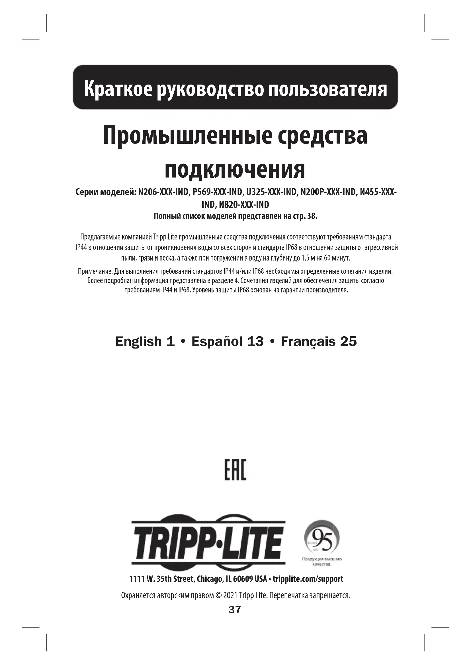 Полный список моделей представлен на стр. 38. Предлагаемые компанией Tripp Lite промышленные средства подключения соответствуют требованиям стандарта IP44 в отношении защиты от проникновения воды со всех сторон и стандарта IP68 в отношении защиты от агрессивной пыли, грязи и песка, а также при погружении в воду на глубину до 1,5 м на 60 минут.Примечание. Для выполнения требований стандартов IP44 и/или IP68 необходимы определенные сочетания изделий. Более подробная информация представлена в разделе 4. Сочетания изделий для обеспечения защиты согласно требованиям IP44 и IP68. Уровень защиты IP68 основан на гарантии производителя. 1111 W. 35th Street, Chicago, IL 60609 USA • tripplite.com/support Охраняется авторским правом © 2021 Tripp Lite. Перепечатка запрещается. English 1 • Español 13 • Français 2538