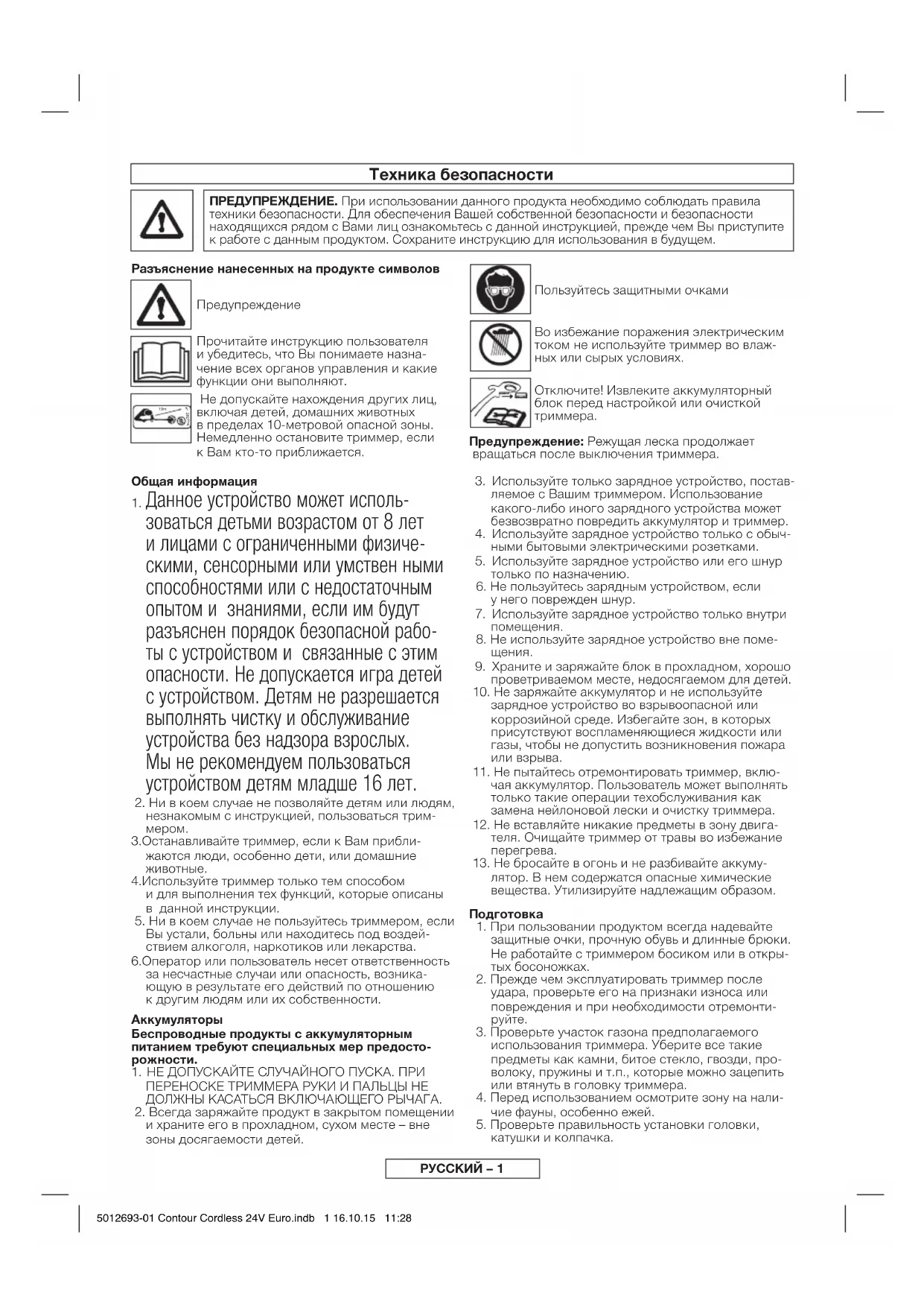 - Atsargiai! „Husqvarna UK Ltd.“ neprisiima garantinės atsakomy- bės už defektus, atsiradusius visiškai arba iš dalies, tiesiogiai ar netiesiogiai, sumontavus atsargines dalis ar papildomas dalis, kurių nepagamino ar nepatvirtino „Husqvarna UK Ltd.“, arba bet kokiu būdu modifikavus mašiną. 5012693-01 Contour Cordless 24V Euro.indb 5 16.10.15 11:28РУССКИЙ – 1 Техника безопасности ПРЕДУПРЕЖДЕНИЕ. При использовании данного продукта необходимо соблюдать правила техники безопасности. Для обеспечения Вашей собственной безопасности и безопасности находящихся рядом с Вами лиц ознакомьтесь с данной инструкцией, прежде чем Вы приступите к работе с данным продуктом. Сохраните инструкцию для использования в будущем. Разъяснение нанесенных на продукте символов Предупреждение Прочитайте инструкцию пользователя и убедитесь, что Вы понимаете назна- чение всех органов управления и какие функции они выполняют. Не допускайте нахождения других лиц, включая детей, домашних животных в пределах 10-метровой опасной зоны. Немедленно остановите триммер, если к Вам кто-то приближается. Пользуйтесь защитными очками Во избежание поражения электрическим током не используйте триммер во влаж- ных или сырых условиях. Отключите! Извлеките аккумуляторный блок перед настройкой или очисткой
