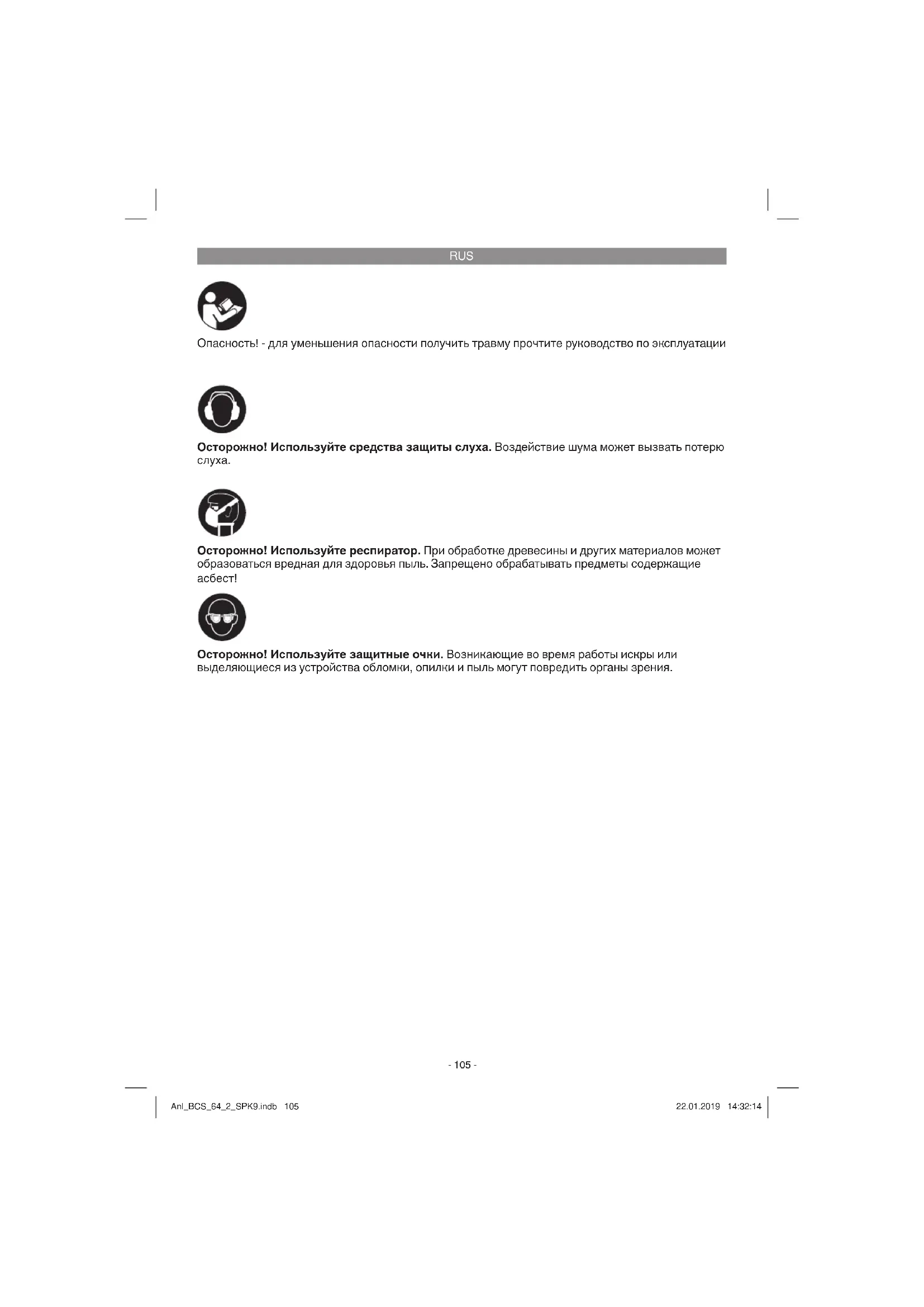 Опасность! - для уменьшения опасности получить травму прочтите руководство по эксплуатации Осторожно! Используйте средства защиты слуха. Воздействие шума может вызвать потерю