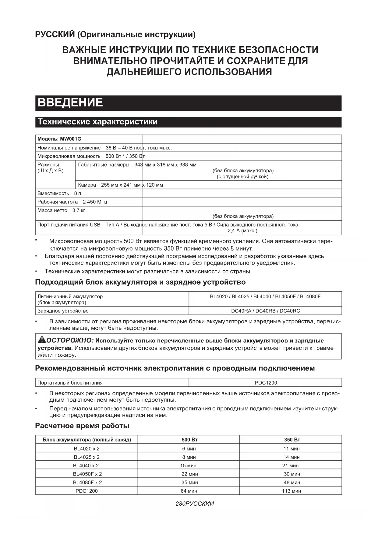 - Передначаломиспользованияисточникаэлектропитанияспроводнымподключениемизучитеинструк- циюипредупреждающиенадписинанем. Расчетное время работы Блок аккумулятора (полный заряд) 500 Вт 350 ВтBL4020 x 2 6мин 11минBL4025 x 2 8мин 14минBL4040 x 2 15мин 21минBL4050F x 2 22мин 30минBL4080F x 2 35мин 48минPDC1200 84мин 113мин281 РУССКИЙ ПРИМЕЧАНИЕ:Значенияуказаныприблизительноизависятотуровнязарядкииусловийиспользования. ПРИМЕЧАНИЕ:Расчетноевремяработысоднимаккумуляторомсоставляетпримернополовинупериода, обеспечиваемогоприиспользованиидвухаккумуляторов.