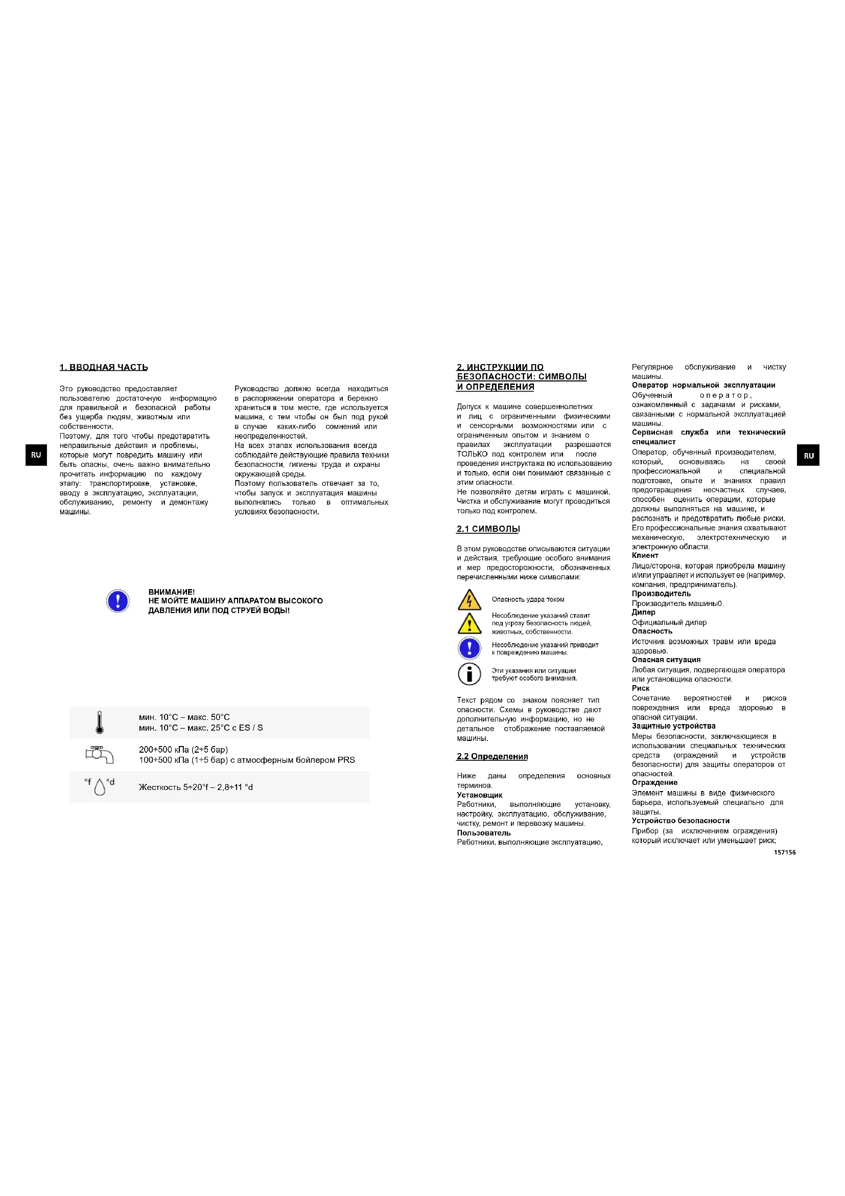 Устройство безопасности Прибор (за исключением ограждения) который исключает или уменьшает риск; °f °d Опасность удара током Несоблюдение указаний ставит под угрозу безопасность людей, животных, собственности. Эти указания или ситуации требуют особого внимания. Несоблюдение указаний приводит к повреждению машины.159158