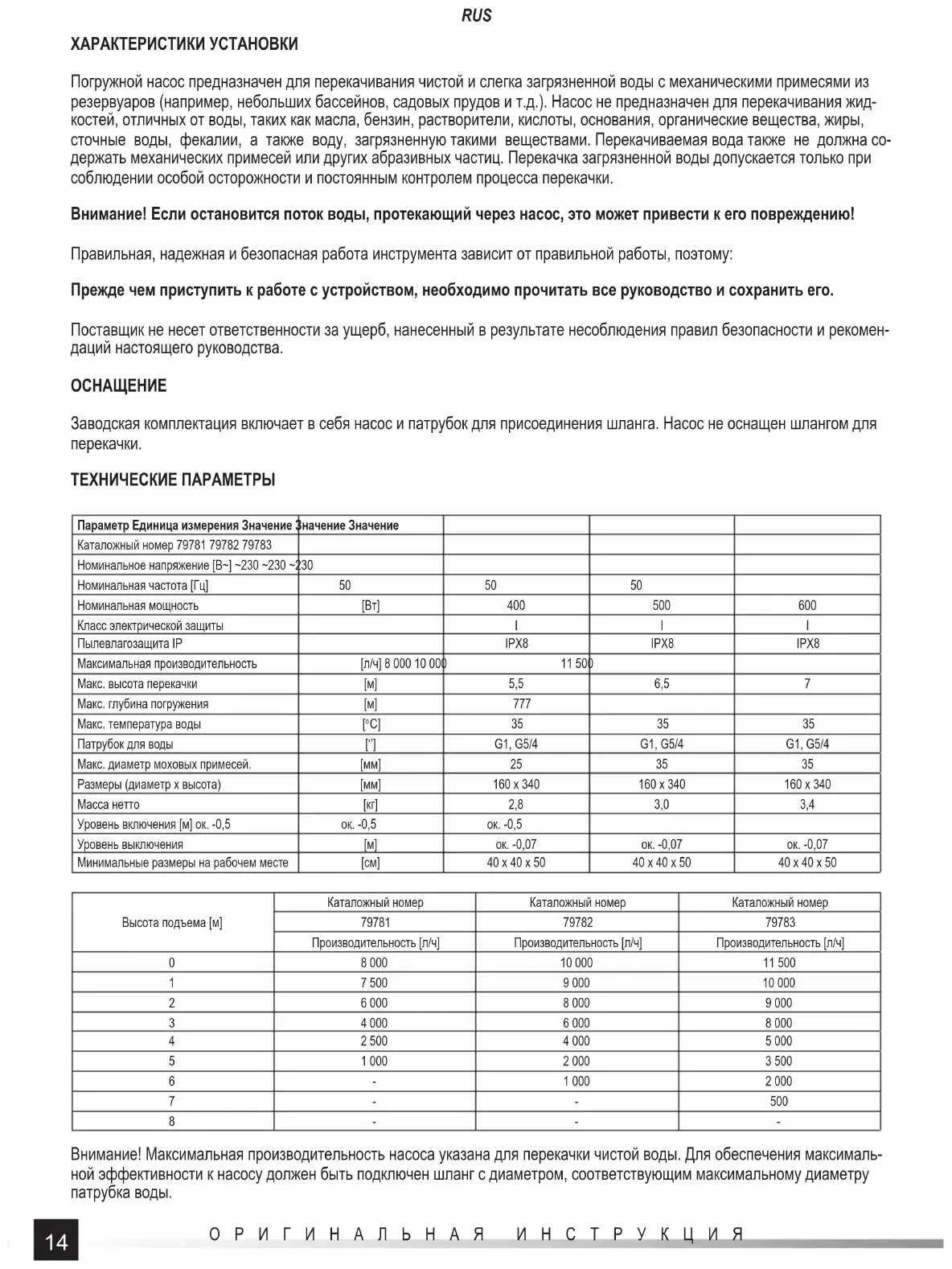 8--- Внимание! Максимальная производительность насоса указана для перекачки чистой воды. Для обеспечения максималь- ной эффективности к насосу должен быть подключен шланг с диаметром, соответствующим максимальному диаметру патрубка воды.15 ОРИГИНАЛЬНАЯ ИНСТРУКЦИЯ RUS ИНСТРУКЦИИ ПО ТЕХНИКЕ БЕЗОПАСНОСТИ ВНИМАНИЕ! Прочитайте все нижеприведенные инструкции. Их несоблюдение может привести к поражению электриче- ским током, пожару или к травме. НЕОБХОДИМО СОБЛЮДАТЬ НИЖЕУКАЗАННЫЕ ИНСТРУКЦИИ Рекомендации по использованию устройства Устройство предназначено только для перекачивания чистой или слегка загрязненной воды с механическими примесями. Механические примеси не должны быть абразивными, а размер отдельных частиц не должен превышать размер, ука- занный в таблице технических данных. Устройство не предназначено для перекачивания других жидкостей, кроме воды, таких как масла, бензин, растворители, кислоты, щелочи, органические вещества, жиры, сточные воды, фекалии, а также воды, загрязненной такими веществами. Во время работы устройство должно все время находиться под наблюдением. Не допускайте работы насоса всухую. Это приведет к перегреву насоса, что может вызвать его повреждение и возгорание или поражение электрическим током. Насос не должен использоваться: для перекачки воды, предназначенной для питья; для непрерывной работы, например, для подачи воды в фонтан; для перекачки воды при температуре выше указанной в таблице технических данных. Запрещается самостоятельно ремонтировать, разбирать или модифицировать устройство. Все ремонтные работы долж- ны выполняться авторизованным ремонтным центром. Следует чистить насос только струей чистой воды. Данное устройство не предназначено для использования детьми младше 8 лет и лицами с ограниченными физическими и умственными способностями, а также лицами с отсутствием опыта и знания оборудования. Это возможно только в случае, если будет обеспечен присмотр или инструктаж, касающийся использования устройства безопасным способом, таким образом, чтобы связанные с этим риски были понятны. Не позволяйте детям играть с устройством. Дети без при- смотра не должны выполнять очистку и техническое обслуживание устройства. Рекомендации по транспортировке и установке устройства Предупреждение! Запрещается подключать насос к источнику питания во время погружения. Вилка кабеля питания насо- са должна быть отключена от розетки. Насос всасывает воду через отверстия в основании. Насос следует погрузить в воду, предварительно прикрепив кабель к ручке в верхней части корпуса насоса. Не используйте кабель питания для погружения насоса в воду. Кабель питания не может быть сильно натянут. Если насос опускается в резервуар для воды, дно которого загрязнено, например, песком или шламом, или если резерву- ар для воды не имеет жесткого дна, следует предохранить насос от опускания на дно. Насос, всасывающий отходы, будет работать менее эффективно. Кроме того, загрязнение приведет к более быстрому износу насоса. Чрезмерное загрязне- ние может привести к засорению впускных отверстий насоса, что может привести к его повреждению. Запрещается погружать насос в водные объекты, в которых находятся люди. Если насос будет погружаться в резервуары с небольшой площадью поверхности, например, в скважин