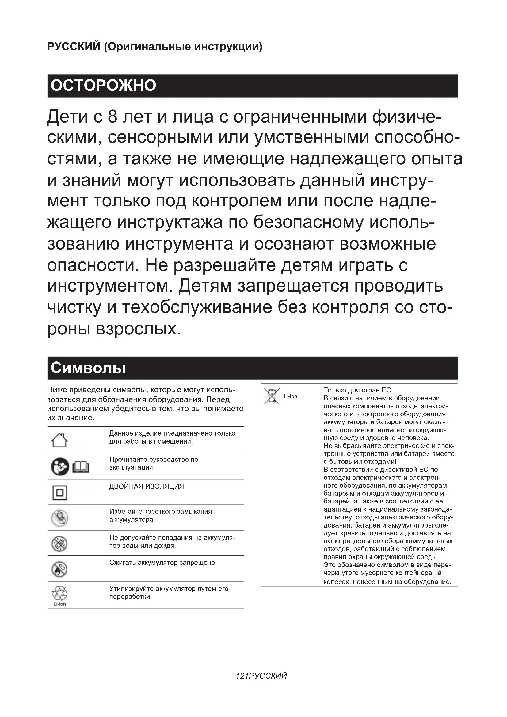Дети с 8 лет и лица с ограниченными физиче- скими, сенсорными или умственными способно- стями, а также не имеющие надлежащего опыта и знаний могут использовать данный инстру- мент только под контролем или после надле- жащего инструктажа по безопасному исполь- зованию инструмента и осознают возможные опасности. Не разрешайте детям играть с инструментом. Детям запрещается проводить чистку и техобслуживание без контроля со сто- роны взрослых.