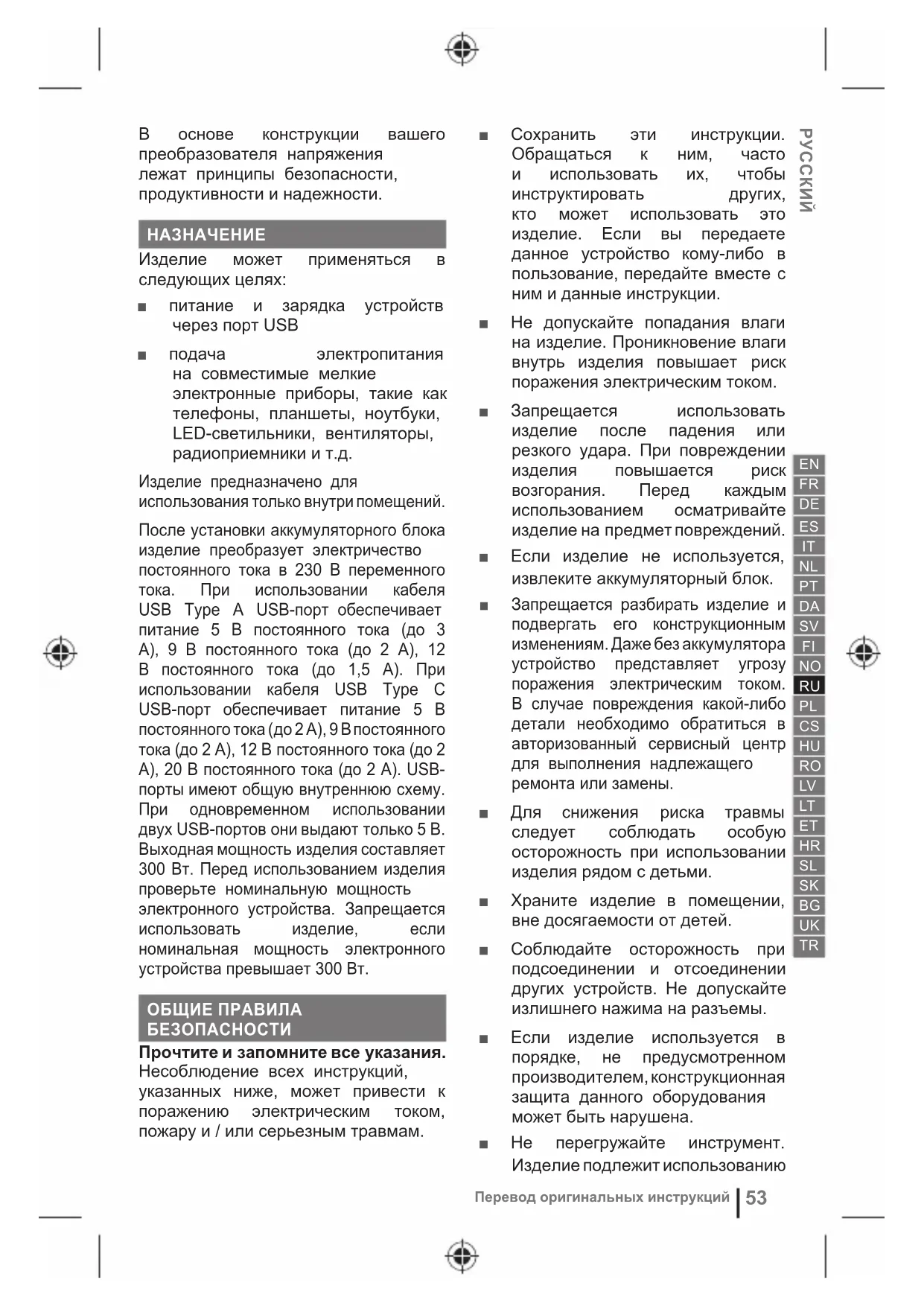Изделие может применяться в следующих целях: ■ питание и зарядка устройств через порт USB ■ подача электропитания на совместимые мелкие электронные приборы, такие как телефоны, планшеты, ноутбуки, LED-светильники, вентиляторы, радиоприемники и т.д. Изделие предназначено для использования только внутри помещений. После установки аккумуляторного блока изделие преобразует электричество постоянного тока в 230 В переменного тока. При использовании кабеля USB Type A USB-порт обеспечивает питание 5 В постоянного тока (до 3 A), 9 В постоянного тока (до 2 A), 12 В постоянного тока (до 1,5 A). При использовании кабеля USB Type C USB-порт обеспечивает питание 5 В постоянного тока ( до 2 A), 9 В постоянного тока (до 2 A), 12 В постоянного тока (до 2 A), 20 В постоянного тока (до 2 A). USB- порты имеют общую внутреннюю схему. При одновременном использовании двух USB-портов они выдают только 5 В. Выходная мощность изделия составляет 300 Вт. Перед использованием изделия проверьте номинальную мощность электронного устройства. Запрещается использовать изделие, если номинальная мощность электронного устройства превышает 300 Вт. ОБЩИЕ ПРАВИЛА БЕЗОПАСНОСТИ Прочтите и запомните все указания. Несоблюдение всех инструкций, указанных ниже, может привести к поражению электрическим током, пожару и / или серьезным травмам. ■ Сохранить эти инструкции. Обращаться к ним, часто и использовать их, чтобы инструктировать других, кто может использовать это изделие. Если вы передаете данное устройство кому-либо в пользование, передайте вместе с ним и данные инструкции. ■ Не допускайте попадания влаги на изделие. Проникновение влаги внутрь изделия повышает риск поражения электрическим током. ■ Запрещается использовать изделие после падения или резкого удара. При повреждении изделия повышается риск возгорания. Перед каждым использованием осматривайте изделие на предмет повреждений. ■ Если изделие не используется, извлеките аккумуляторный блок. ■ Запрещается разбирать изделие и подвергать его конструкционным изменениям. Даже без аккумулятора устройство представляет угрозу поражения электрическим током. В случае повреждения какой-либо детали необходимо обратиться в авторизованный сервисный центр для выполнения надлежащего ремонта или замены. ■ Для снижения риска травмы следует соблюдать особую осторожность при использовании изделия рядом с детьми. ■ Храните изделие в помещении, вне досягаемости от детей. ■ Соблюдайте осторожность при подсоединении и отсоединении других устройств. Не допускайте излишнего нажима на разъемы. ■ Если изделие используется в порядке, не предусмотренном производителем, конструкционная защита данного оборудования может быть нарушена. ■ Не перегружайте инструмент. Изделие подлежит использованию