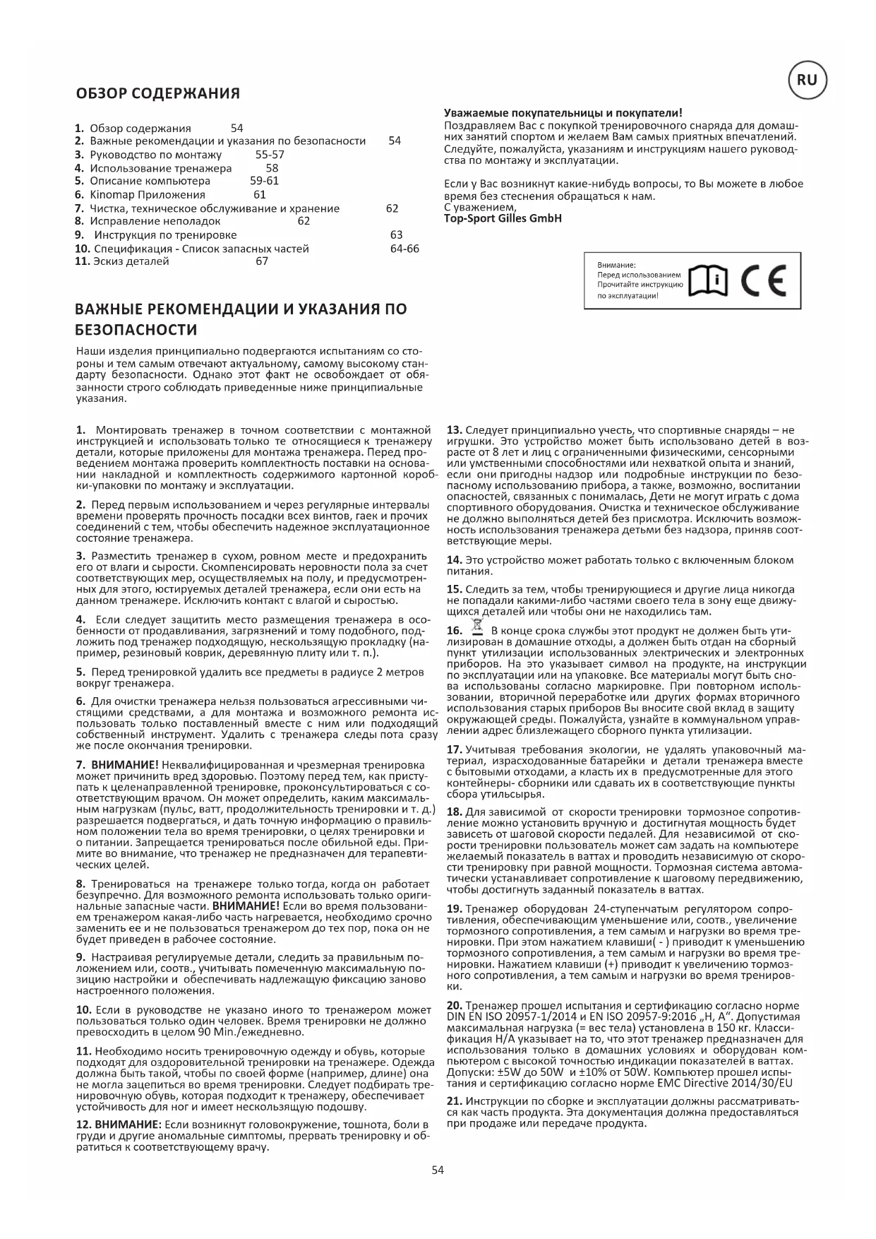ОБЗОР СОДЕРЖАНИЯ ВАЖНЫЕ РЕКОМЕНДАЦИИ И УКАЗАНИЯ ПО БЕЗОПАСНОСТИ Уважаемые покупательницы и покупатели! Поздравляем Вас с покупкой тренировочного снаряда для домаш- них занятий спортом и желаем Вам самых приятных впечатлений. Следуйте, пожалуйста, указаниям и инструкциям нашего руковод- ства по монтажу и эксплуатации. Если у Вас возникнут какие-нибудь вопросы, то Вы можете в любое время без стеснения обращаться к нам. С уважением, Top-Sport Gilles GmbH Наши изделия принципиально подвергаются испытаниям со сто- роны и тем самым отвечают актуальному, самому высокому стан- дарту безопасности. Однако этот факт не освобождает от обя- занности строго соблюдать приведенные ниже принципиальные