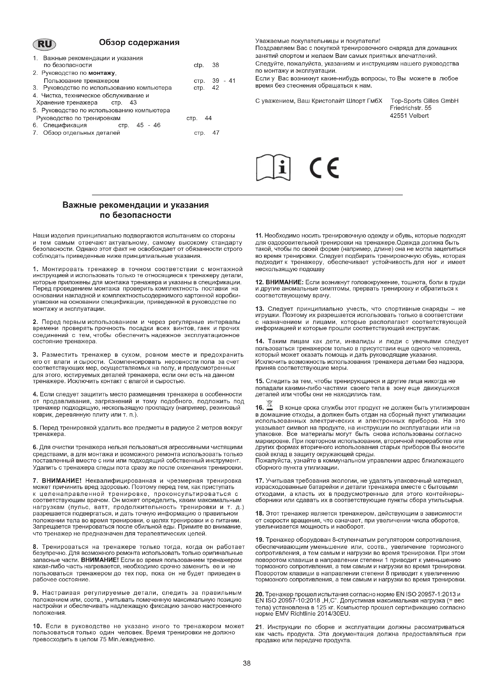Уважаемые покупательницы и покупатели! Поздравляем Вас с покупкой тренировочного снаряда для домашних занятий спортом и желаем Вам самых приятных впечатлений. Следуйте, пожалуйста, указаниям и инструкциям нашего руководства по монтажу и эксплуатации. Если у Вас возникнут какие-нибудь вопросы, то Вы можете в любое время без стеснения обращаться к нам. С уважением, Ваш Кристопайт Шпорт ГмбХ Top-Sports Gilles GmbH Friedrichstr. 55 42551 Velbert39