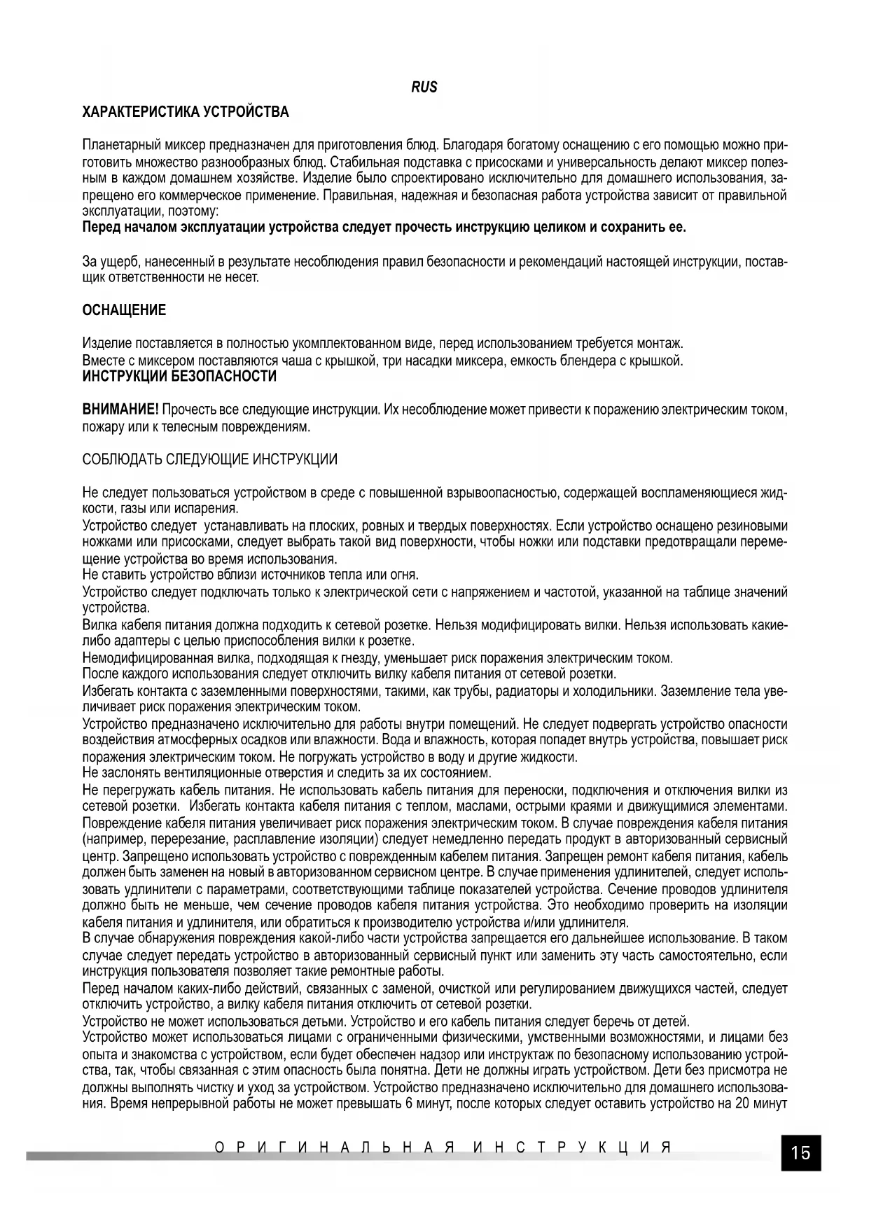 Изделие поставляется в полностью укомплектованном виде, перед использованием требуется монтаж. Вместе с миксером поставляются чаша с крышкой, три насадки миксера, емкость блендера с крышкой. ИНСТРУКЦИИ БЕЗОПАСНОСТИ ВНИМАНИЕ! Прочесть все следующие инструкции. Их несоблюдение может привести к поражению электрическим током, пожару или к телесным повреждениям. СОБЛЮДАТЬ СЛЕДУЮЩИЕ ИНСТРУКЦИИ Не следует пользоваться устройством в среде с повышенной взрывоопасностью, содержащей воспламеняющиеся жид- кости, газы или испарения. Устройство следует устанавливать на плоских, ровных и твердых поверхностях. Если устройство оснащено резиновыми ножками или присосками, следует выбрать такой вид поверхности, чтобы ножки или подставки предотвращали переме- щение устройства во время использования. Не ставить устройство вблизи источников тепла или огня. Устройство следует подключать только к электрической сети с напряжением и частотой, указанной на таблице значений устройства. Вилка кабеля питания должна подходить к сетевой розетке. Нельзя модифицировать вилки. Нельзя использовать какие- либо адаптеры с целью приспособления вилки к розетке. Немодифицированная вилка, подходящая к гнезду, уменьшает риск поражения электрическим током. После каждого использования следует отключить вилку кабеля питания от сетевой розетки. Избегать контакта с заземленными поверхностями, такими, как трубы, радиаторы и холодильники. Заземление тела уве- личивает риск поражения электрическим током. Устройство предназначено исключительно для работы внутри помещений. Не следует подвергать устройство опасности воздействия атмосферных осадков или влажности. Вода и влажность, которая попадет внутрь устройства, повышает риск поражения электрическим током. Не погружать устройство в воду и другие жидкости. Не заслонять вентиляционные отверстия и следить за их состоянием. Не перегружать кабель питания. Не использовать кабель питания для переноски, подключения и отключения вилки из сетевой розетки. Избегать контакта кабеля питания с теплом, маслами, острыми краями и движущимися элементами. Повреждение кабеля питания увеличивает риск поражения электрическим током. В случае повреждения кабеля питания (например, перерезание, расплавление изоляции) следует немедленно передать продукт в авторизованный сервисный центр. Запрещено использовать устройство с поврежденным кабелем питания. Запрещен ремонт кабеля питания, кабель должен быть заменен на новый в авторизованном сервисном центре. В случае применения удлинителей, следует исполь- зовать удлинители с параметрами, соответствующими таблице показателей устройства. Сечение проводов удлинителя должно быть не меньше, чем сечение проводов кабеля питания устройства. Это необходимо проверить на изоляции кабеля питания и удлинителя, или обратиться к производителю устройства и/или удлинителя. В случае обнаружения повреждения какой-либо части устройства запрещается его дальнейшее использование. В таком случае следует передать устройство в авторизованный сервисный пункт или заменить эту часть самостоятельно, если инструкция пользователя позволяет такие ремонтные работы. Перед началом каких-либо действий, связанных с заменой, очисткой или регулированием движущихся частей, следует отключить устройс