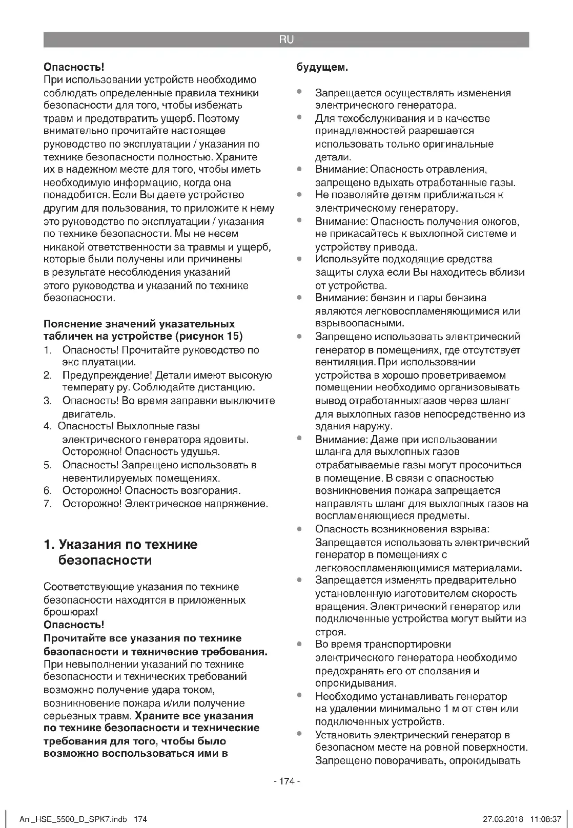 Установить электрический генератор в безопасном месте на ровной поверхности. Запрещено поворачивать, опрокидывать Anl_HSE_5500_D_SPK7.indb 174Anl_HSE_5500_D_SPK7.indb 174 27.03.2018 11:08:3727.03.2018 11:08:37RU