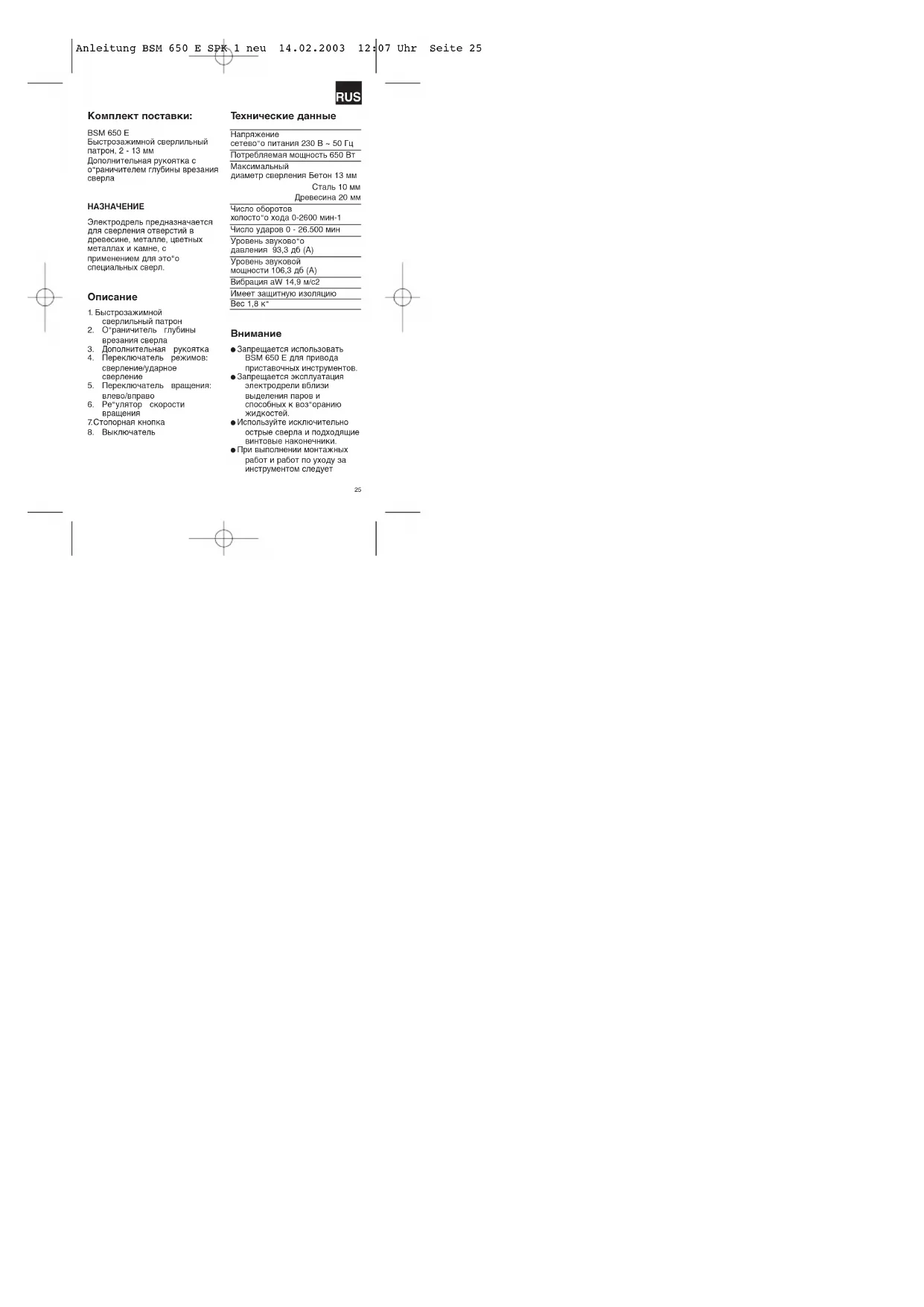 Используйте исключительно острые сверла и подходящие винтовые наконечники. При выполнении монтажных работ и работ по уходу за инструментом следует Anleitung BSM 650 E SPK 1 neu 14.02.2003 12:07 Uhr Seite 25RUS